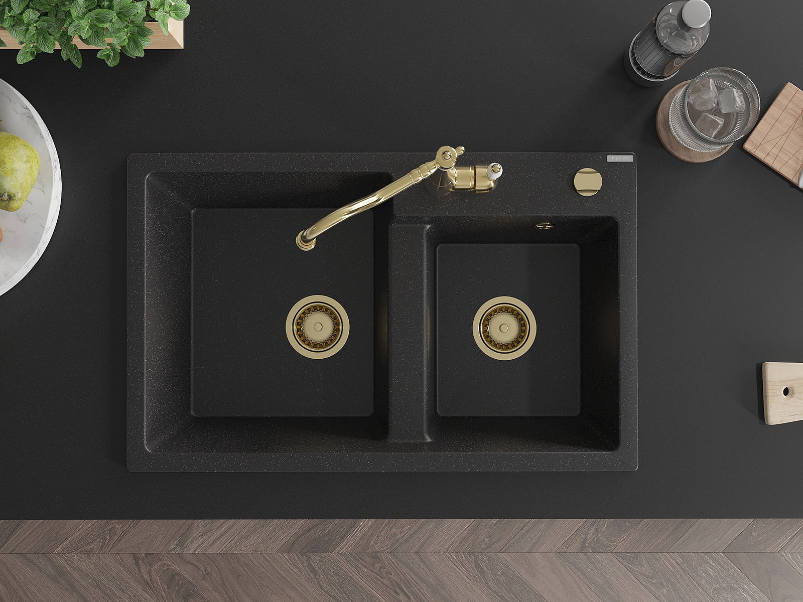 Zlew posiada podfrezowany otwór o średnicy 35 mm do samodzielnego wybicia. Można go wykorzystać m.in. do montażu dozownika na płyn, który wyeliminuje obecność plastikowych butelek w kuchni i nada jej eleganckiego wykończenia.