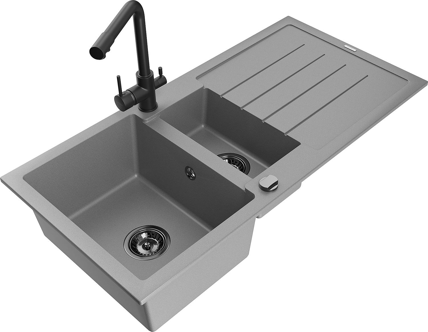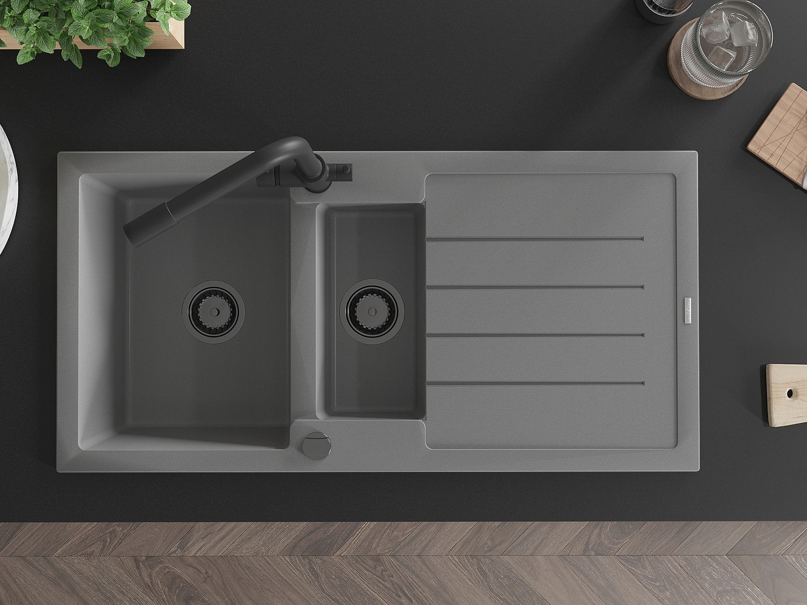 Mexen Andres zlewozmywak granitowy 1,5-komorowy z ociekaczem i baterią kuchenną Duero, szary - 6515-71-671600-70-B