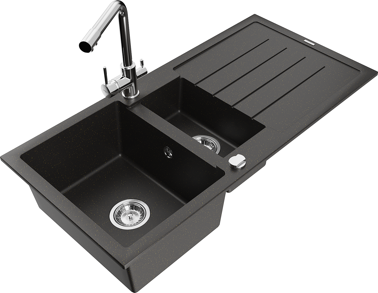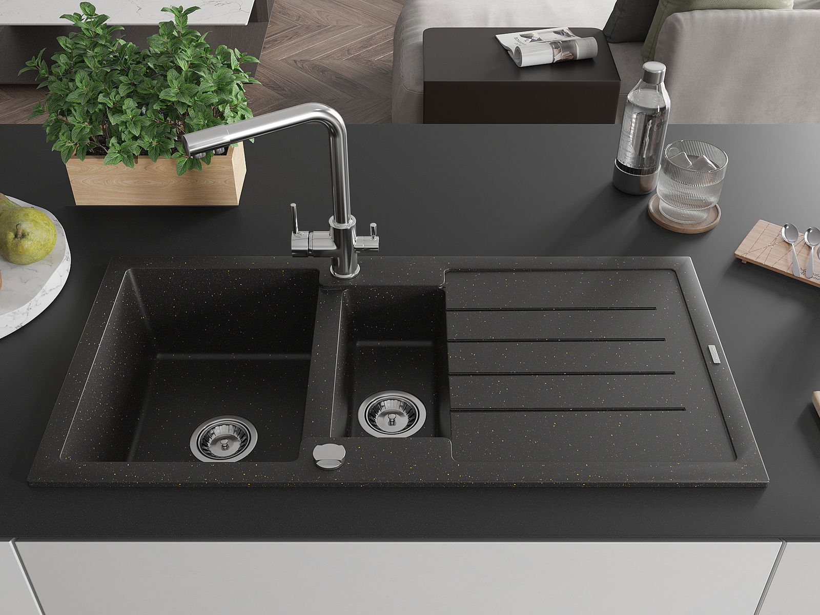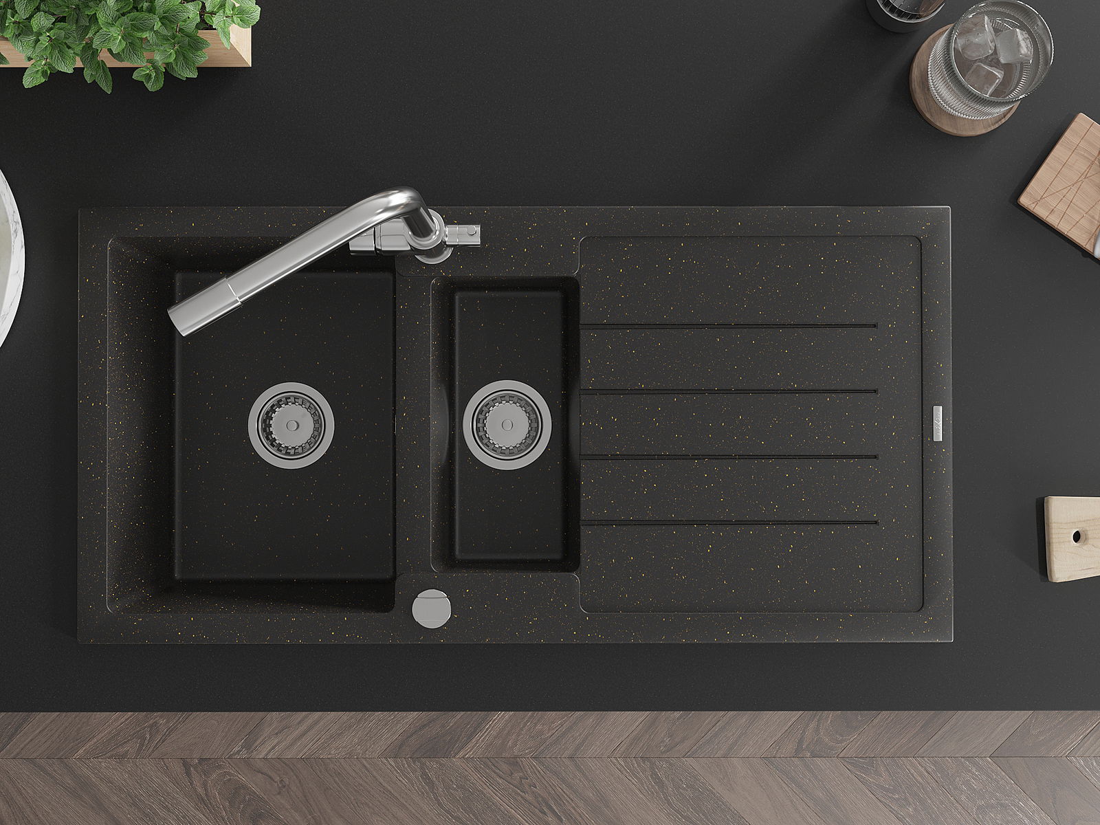 Mexen Andres zlewozmywak granitowy 1,5-komorowy z ociekaczem i baterią kuchenną Duero, czarny/złoty - 6515-75-671600-00