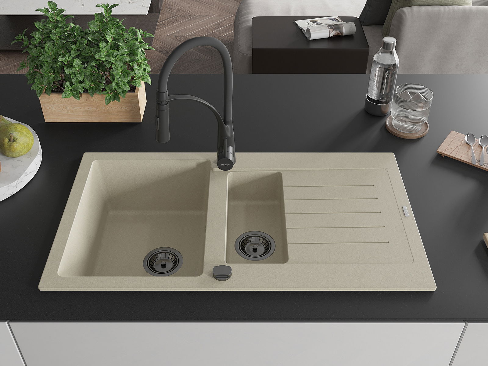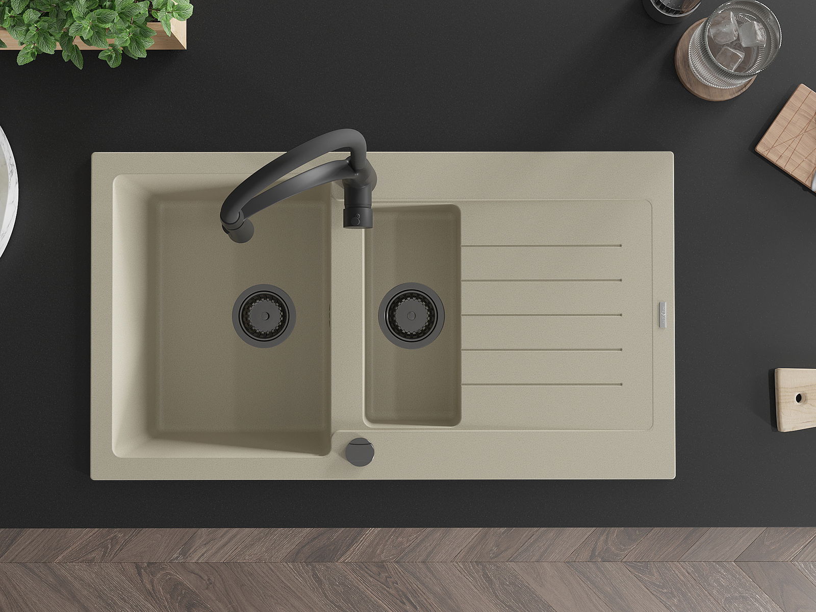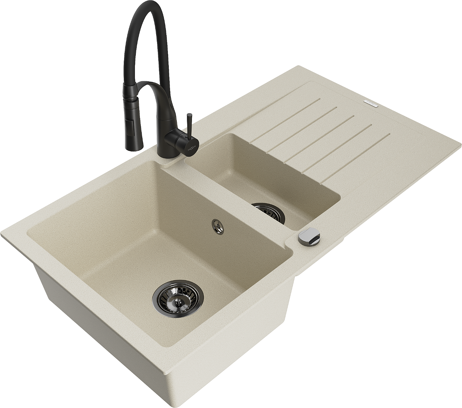 Mexen Matias zlewozmywak granitowy 1,5-komorowy z ociekaczem i baterią kuchenną Aster, beżowy - 6502-69-73450-70-B