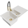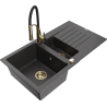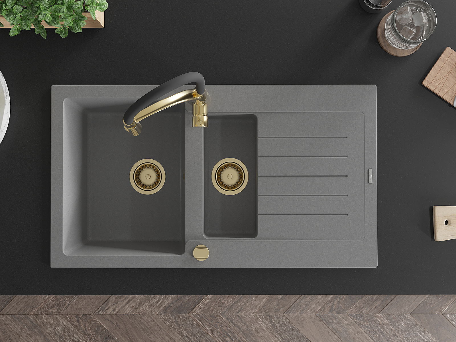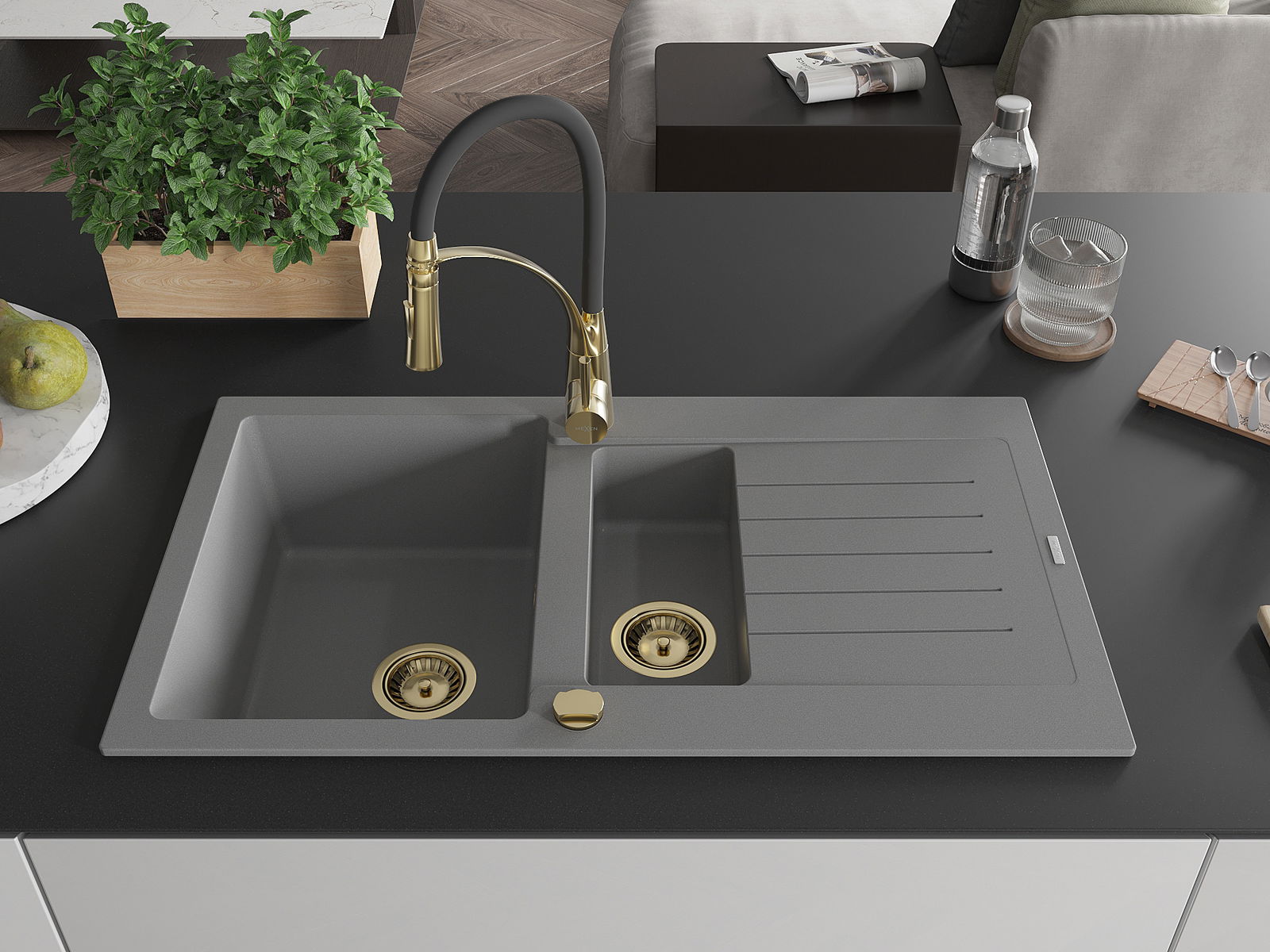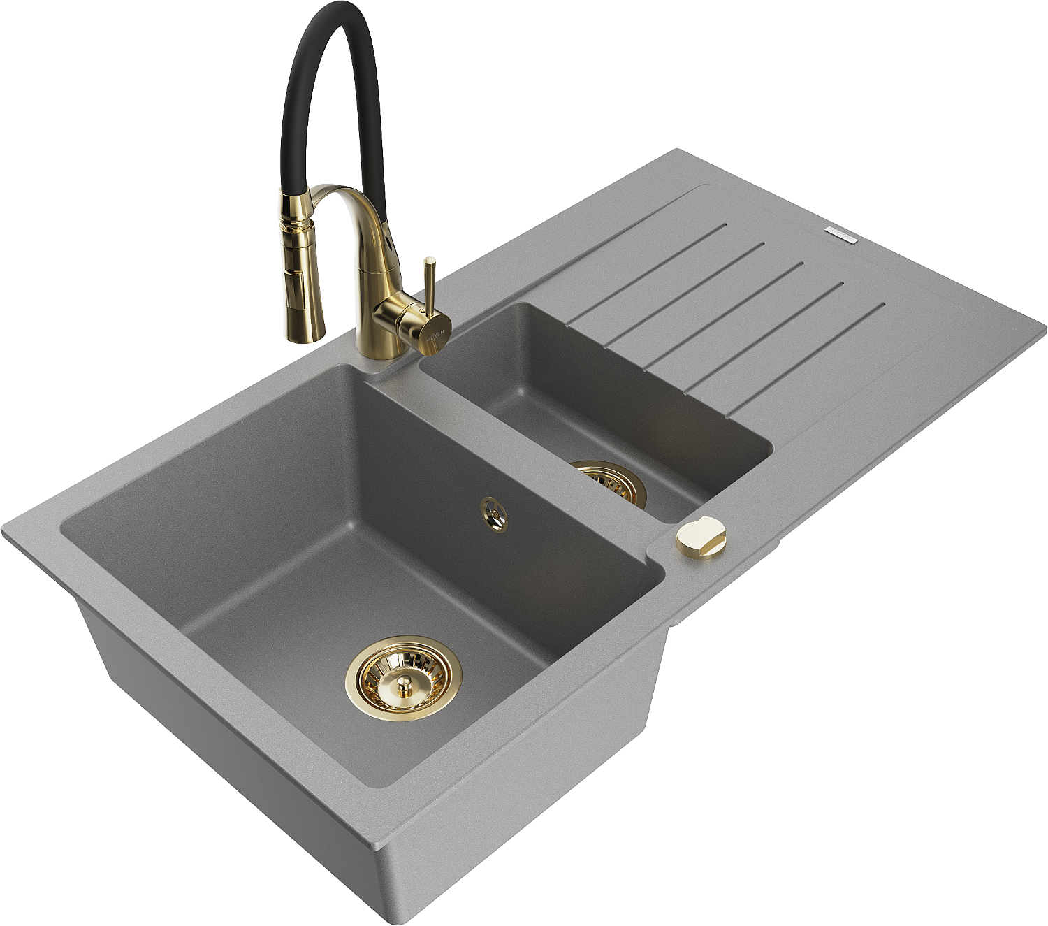 Mexen Matias zlewozmywak granitowy 1,5-komorowy z ociekaczem i baterią kuchenną Aster, szary - 6502-71-73450-57-G