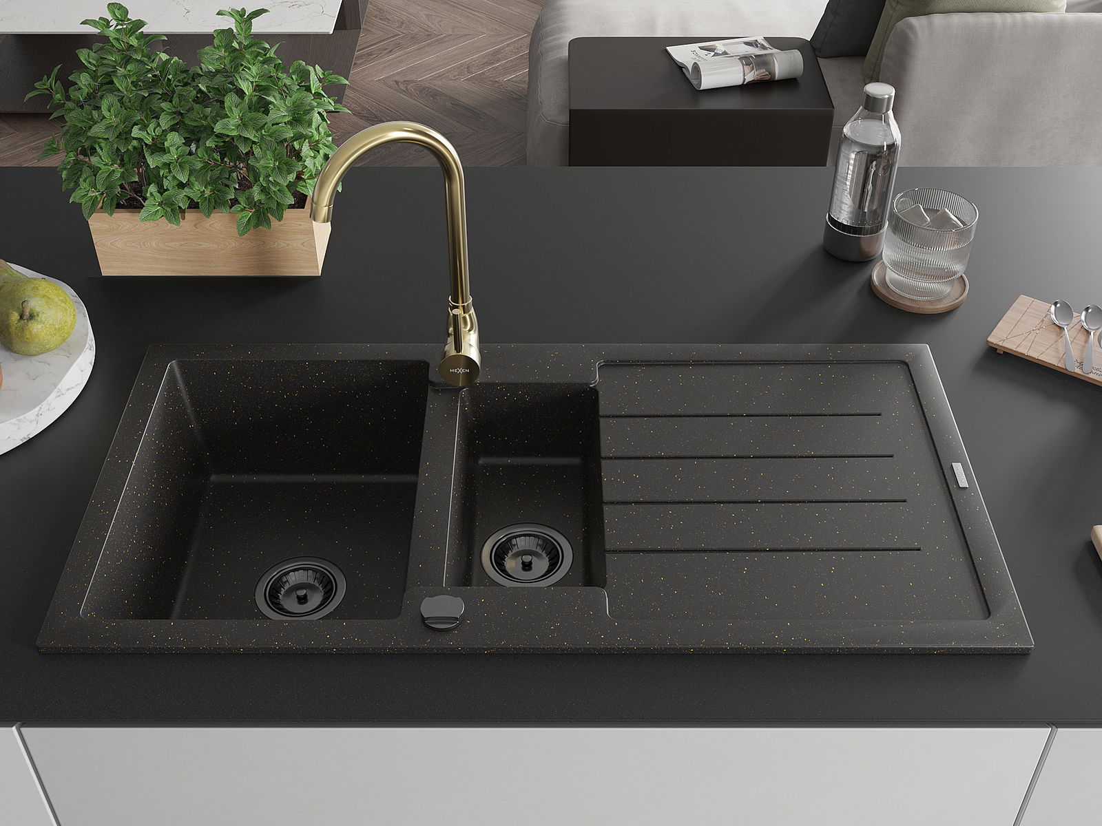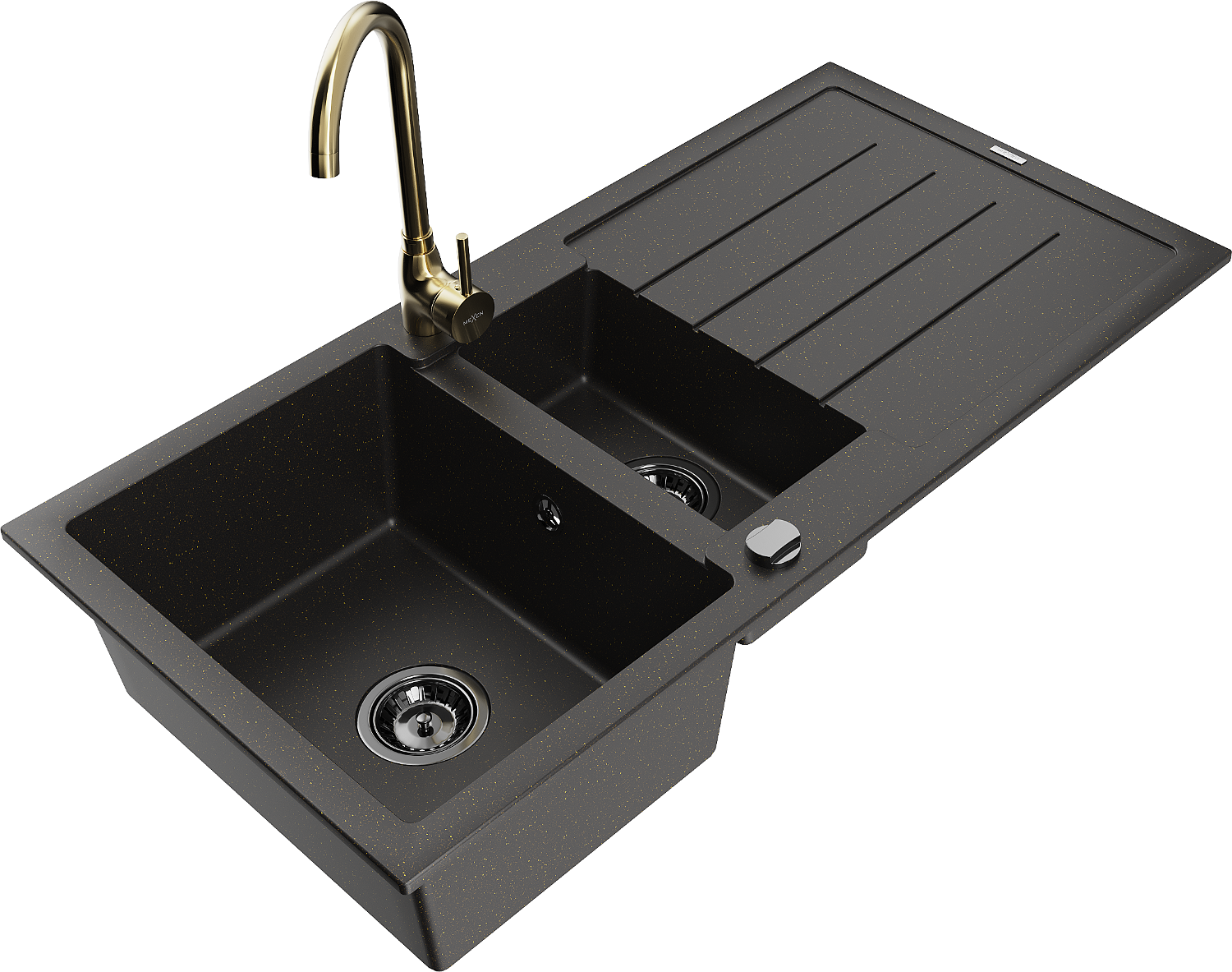 Mexen Andres zlewozmywak granitowy 1,5-komorowy z ociekaczem i baterią kuchenną Telma, czarny/złoty - 6515-75-670200-50-B