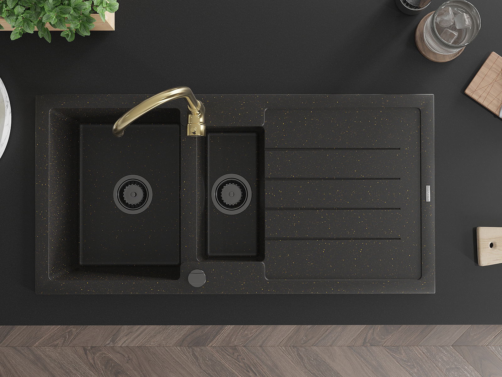 Zlew posiada 2 podfrezowane otwory o średnicy 35 mm, do samodzielnego wybicia. Można je wykorzystać m.in. do montażu dozownika na płyn, który wyeliminuje obecność plastikowych butelek w kuchni i nada jej eleganckiego wykończenia.