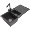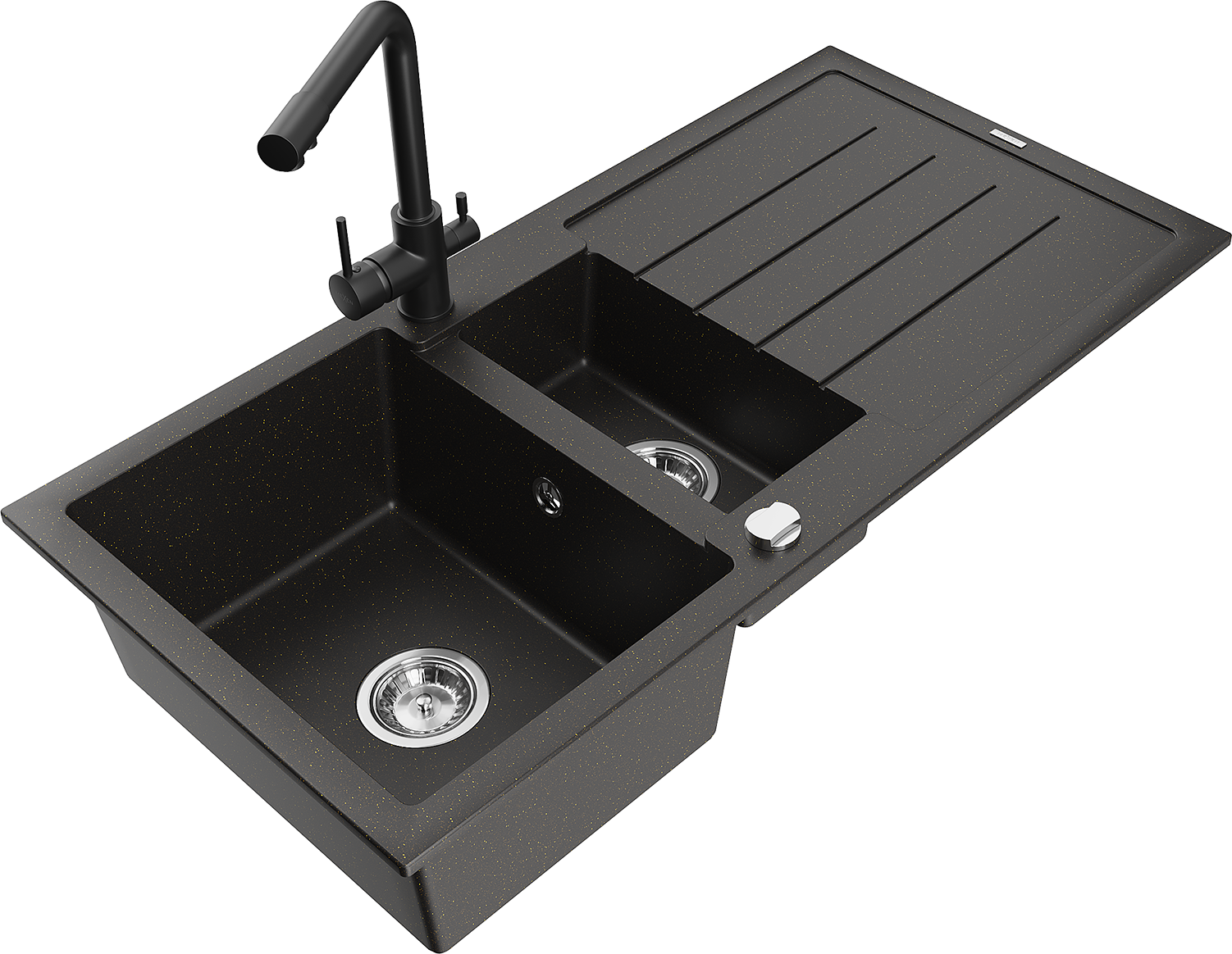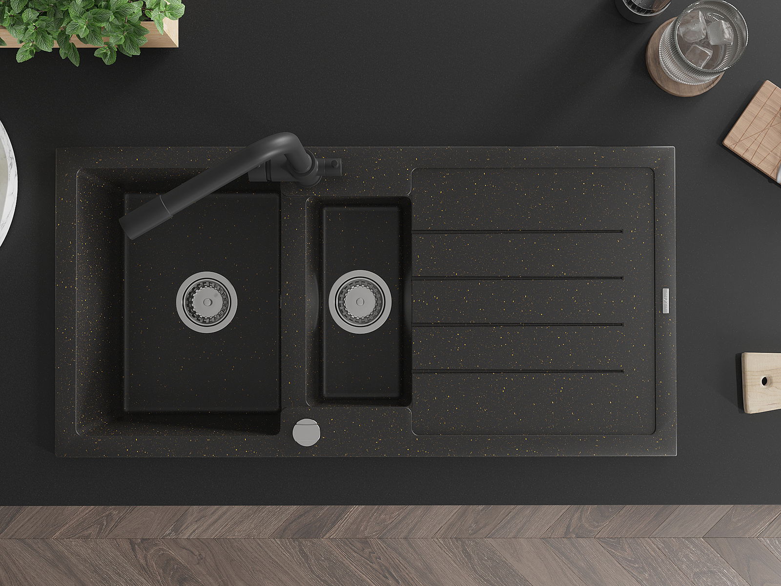Mexen Andres zlewozmywak granitowy 1,5-komorowy z ociekaczem i baterią kuchenną Duero, czarny/złoty - 6515-75-671600-70
