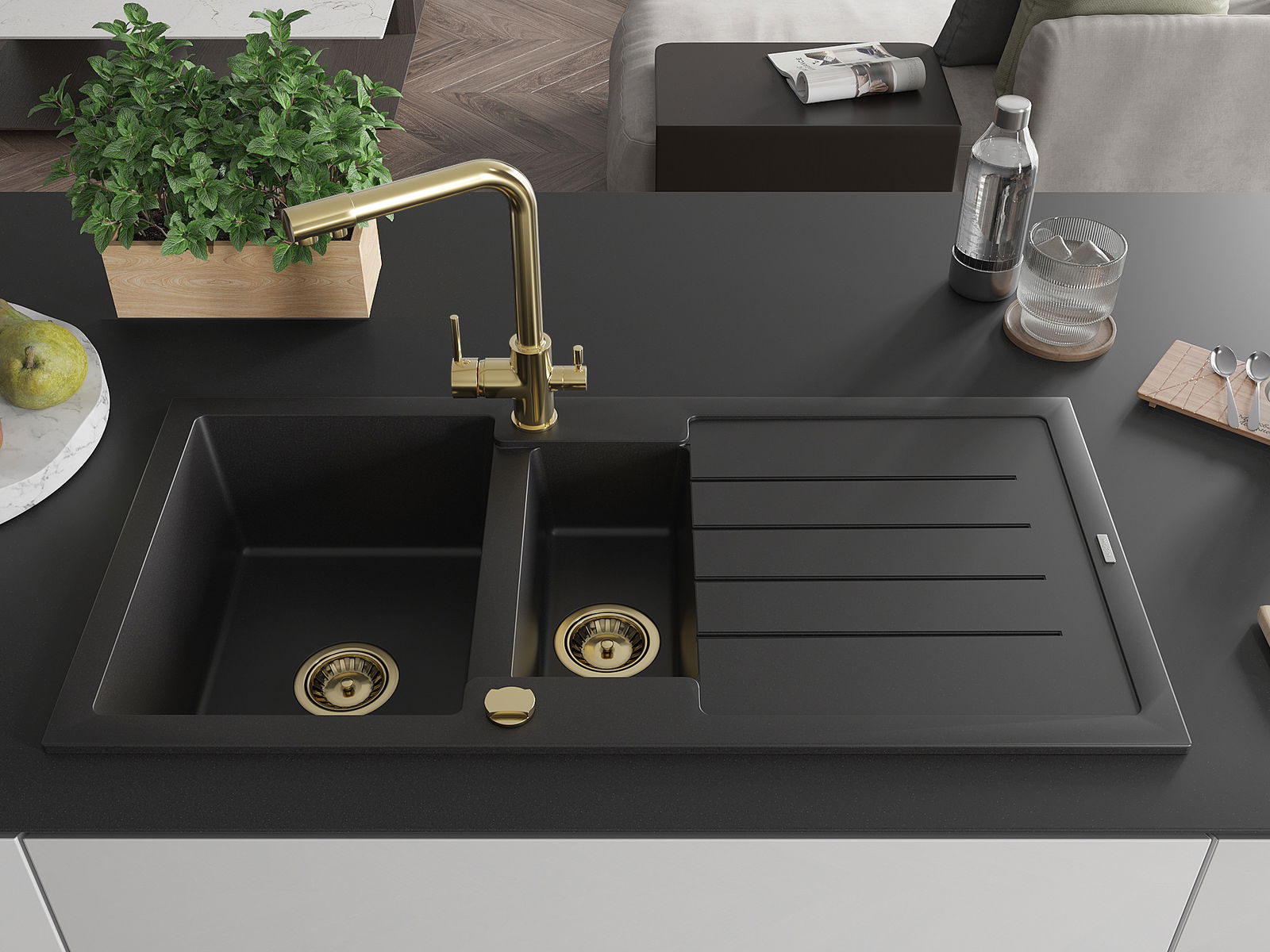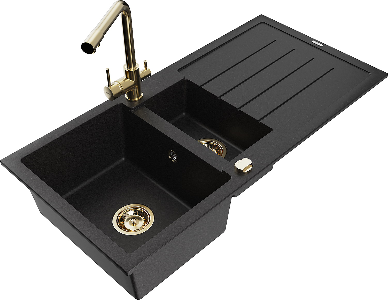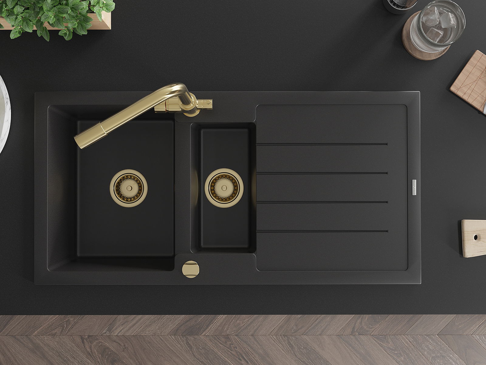 Mexen Andres zlewozmywak granitowy 1,5-komorowy z ociekaczem i baterią kuchenną Duero, czarny - 6515-77-671600-50