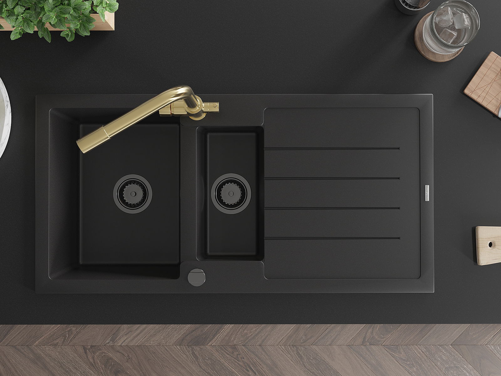 Zlew posiada 2 podfrezowane otwory o średnicy 35 mm, do samodzielnego wybicia. Można je wykorzystać m.in. do montażu dozownika na płyn, który wyeliminuje obecność plastikowych butelek w kuchni i nada jej eleganckiego wykończenia.