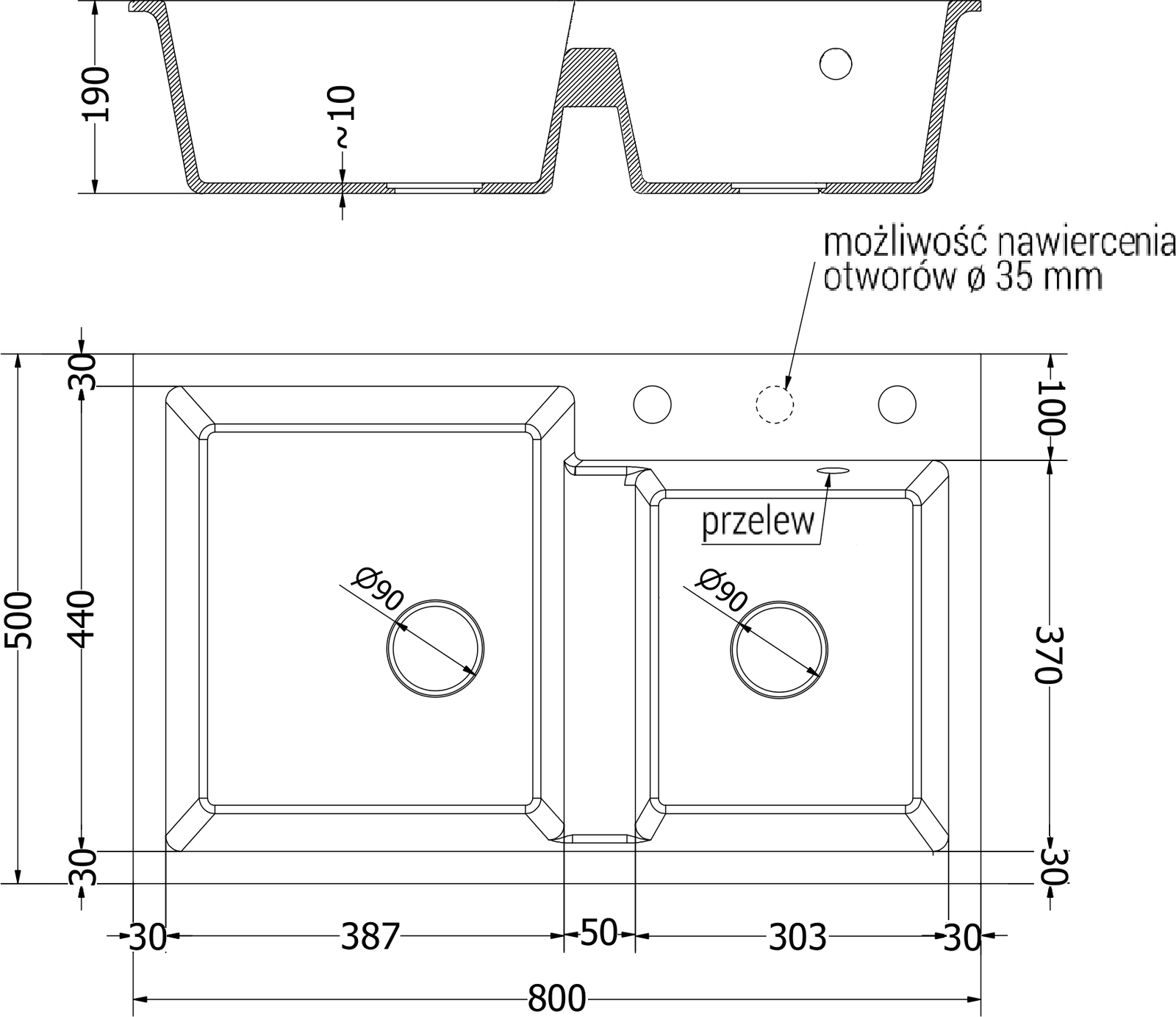 Zlew posiada podfrezowany otwór o średnicy 35 mm do samodzielnego wybicia. Można go wykorzystać m.in. do montażu dozownika na płyn, który wyeliminuje obecność plastikowych butelek w kuchni i nada jej eleganckiego wykończenia.