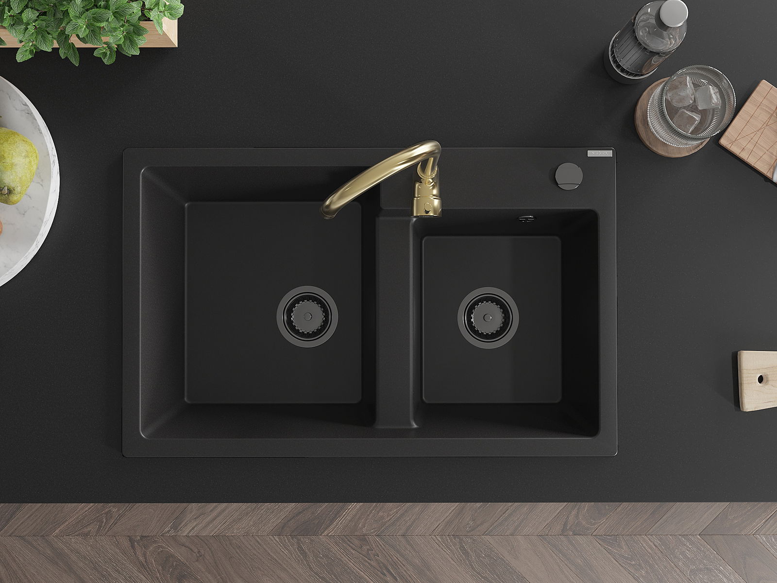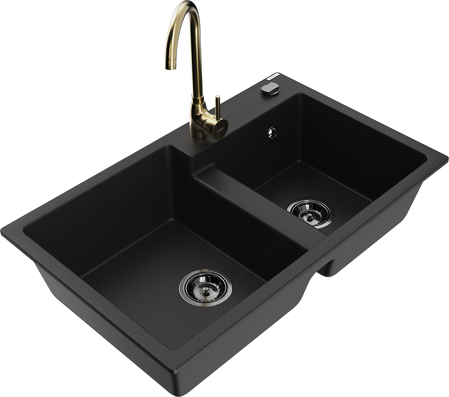 Mexen Tomas zlewozmywak granitowy 2-komorowy z baterią kuchenną Telma, czarny - 6516-77-670200-50-B