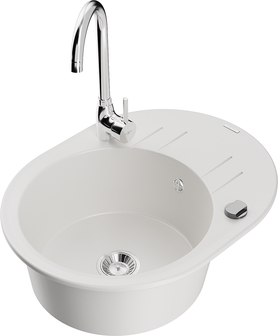 Mexen Kevin zlewozmywak granitowy 1-komorowy z ociekaczem i baterią kuchenną Telma, biały - 6517-20-670200-00