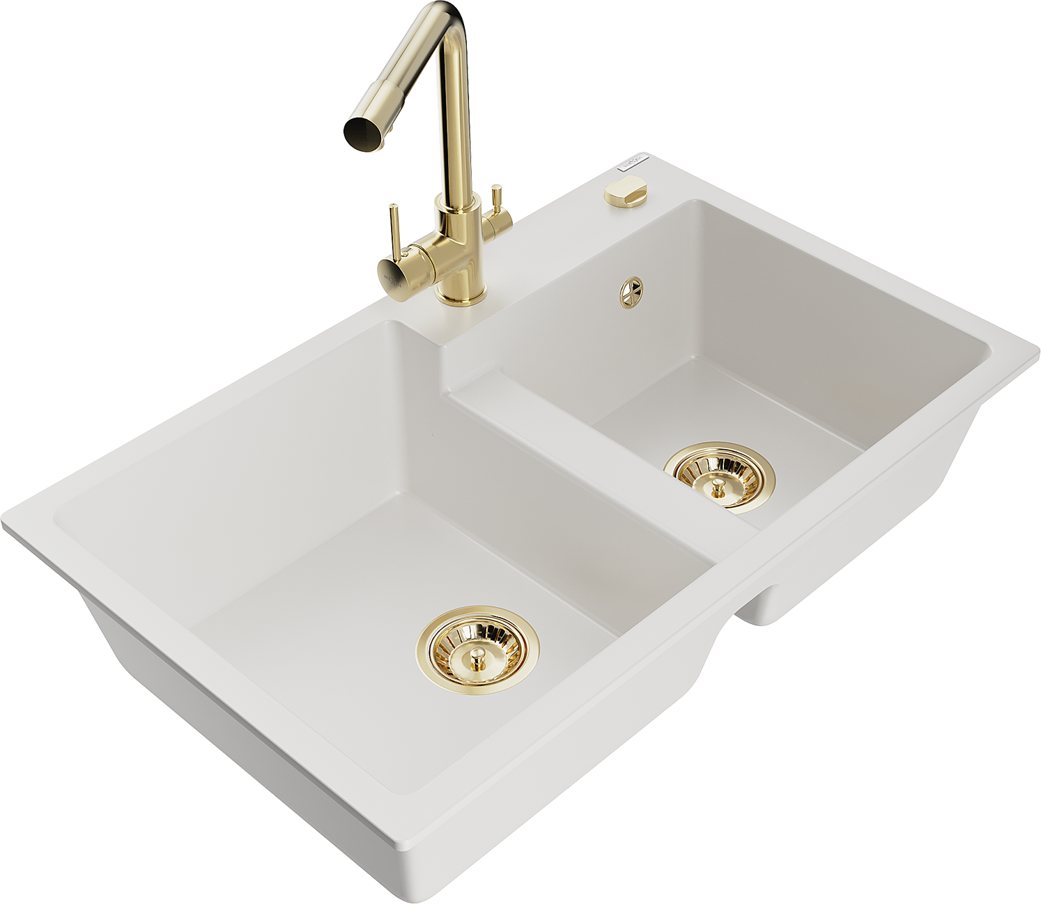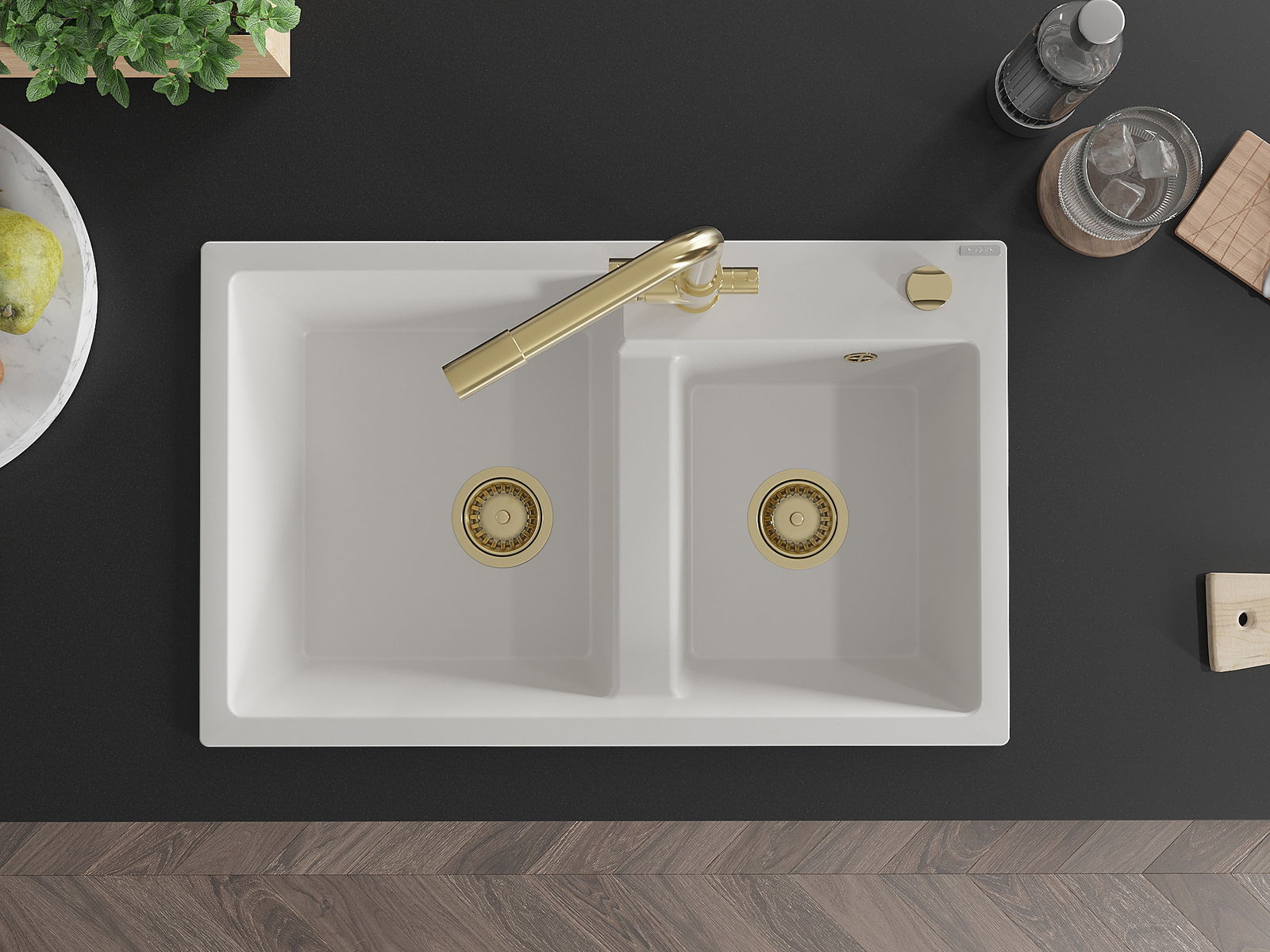 Mexen Tomas zlewozmywak granitowy 2-komorowy z baterią kuchenną Duero, biały - 6516-20-671600-50