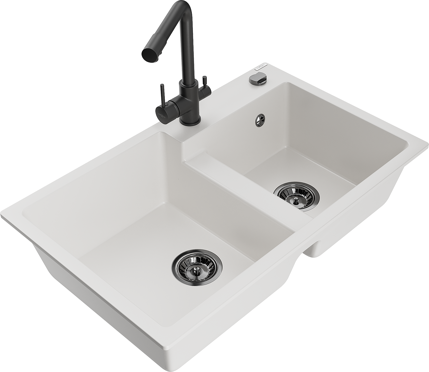 Mexen Tomas zlewozmywak granitowy 2-komorowy z baterią kuchenną Duero, biały - 6516-20-671600-70