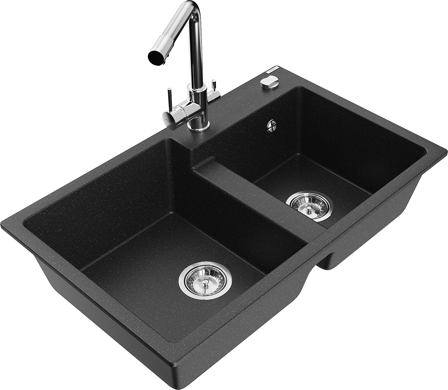 Mexen Tomas zlewozmywak granitowy 2-komorowy z baterią kuchenną Duero, czarny/srebrny metalik - 6516-73-671600-00