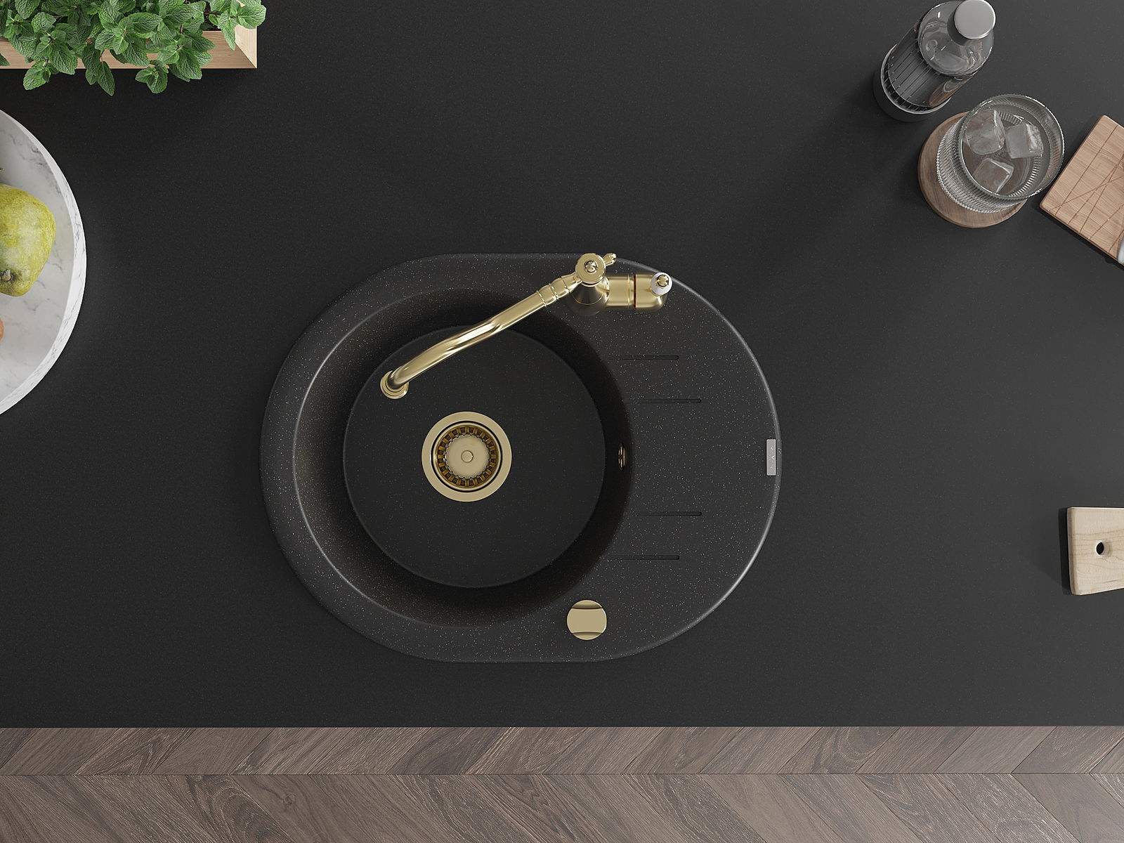 Mexen Kevin zlewozmywak granitowy 1-komorowy z ociekaczem i baterią kuchenną Carla, czarny/srebrny metalik - 6517-73-670700-50