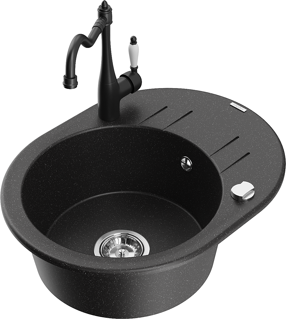 Mexen Kevin zlewozmywak granitowy 1-komorowy z ociekaczem i baterią kuchenną Carla, czarny/srebrny metalik - 6517-73-670700-70