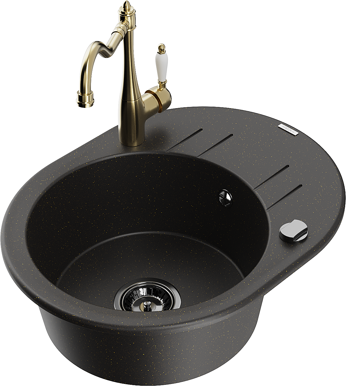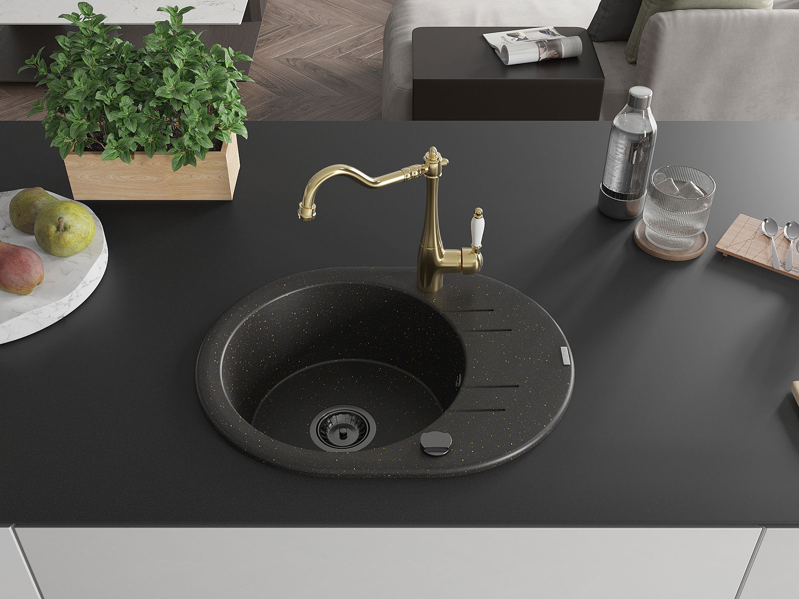 Mexen Kevin zlewozmywak granitowy 1-komorowy z ociekaczem i baterią kuchenną Carla, czarny/złoty metalik - 6517-75-670700-50-B
