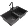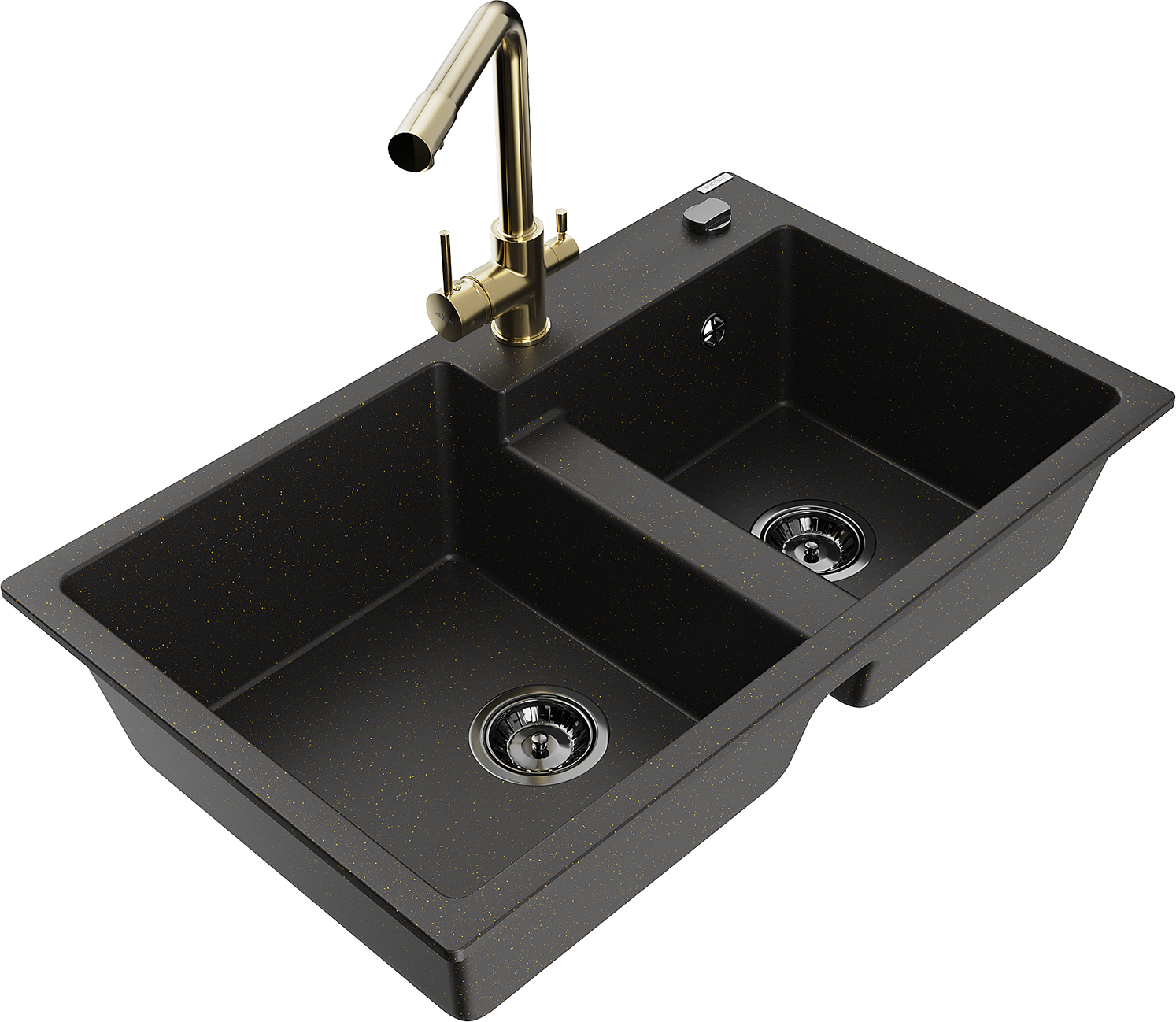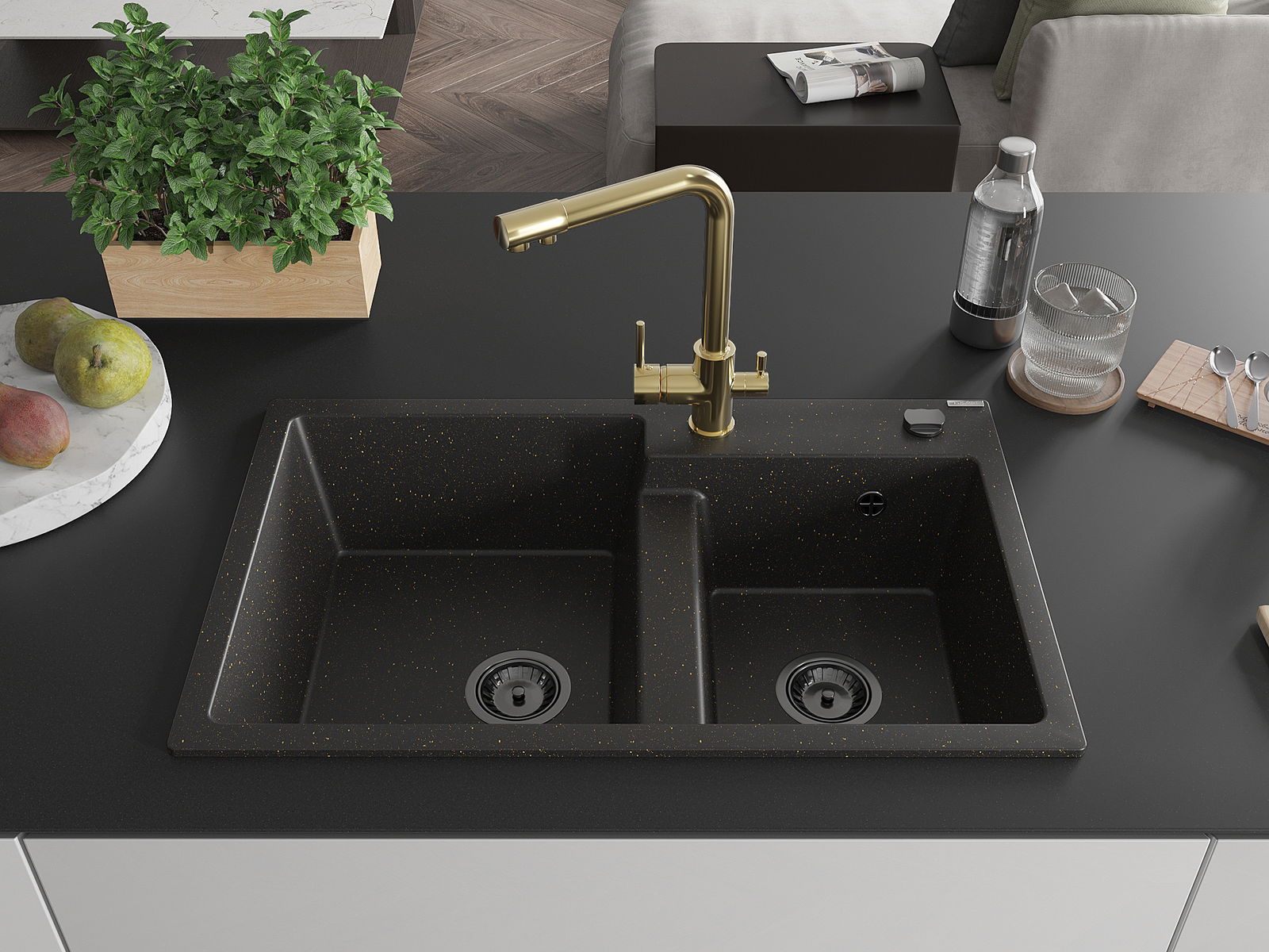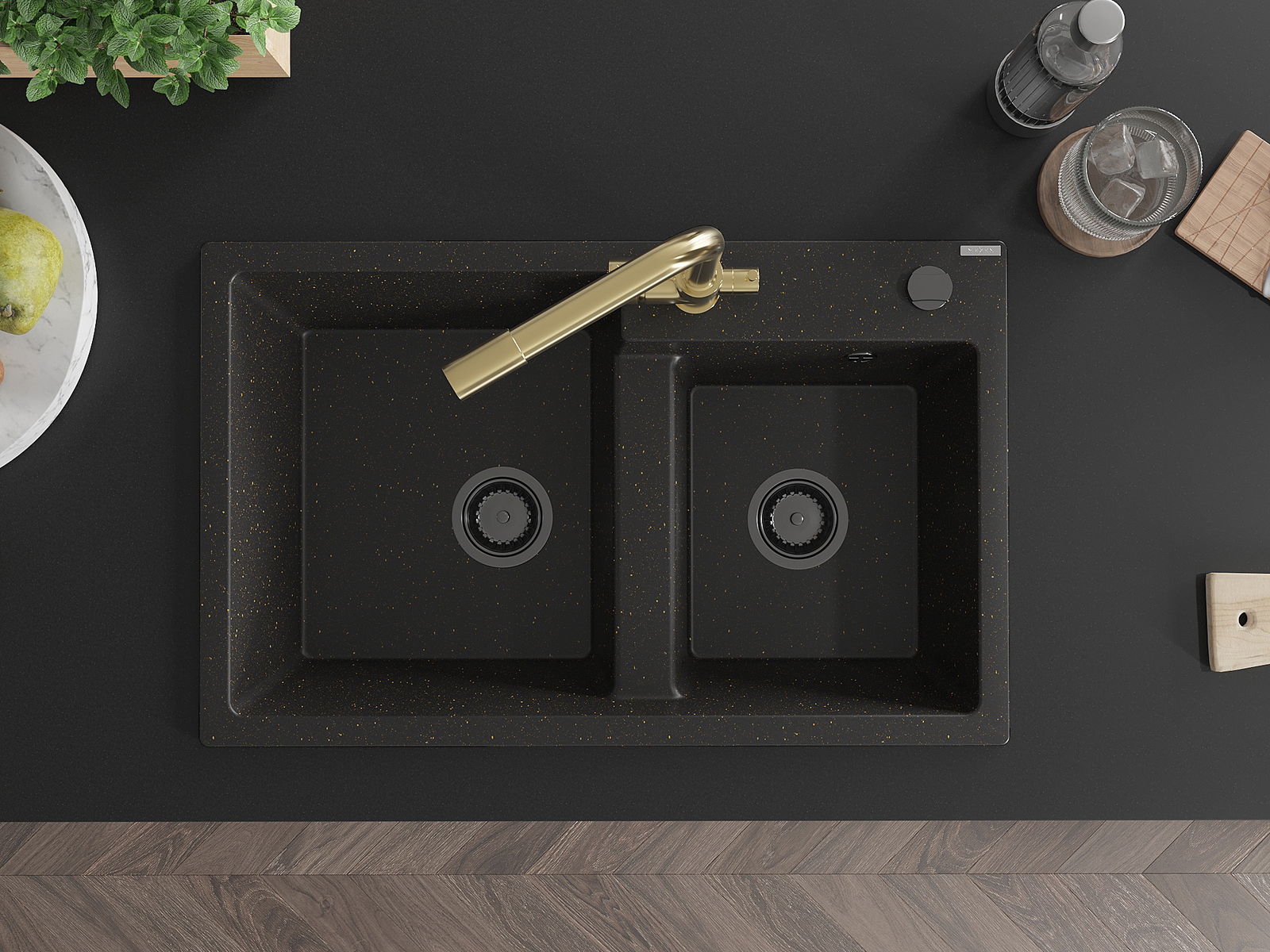 Mexen Tomas zlewozmywak granitowy 2-komorowy z baterią kuchenną Duero, czarny/złoty metalik - 6516-75-671600-50-B
