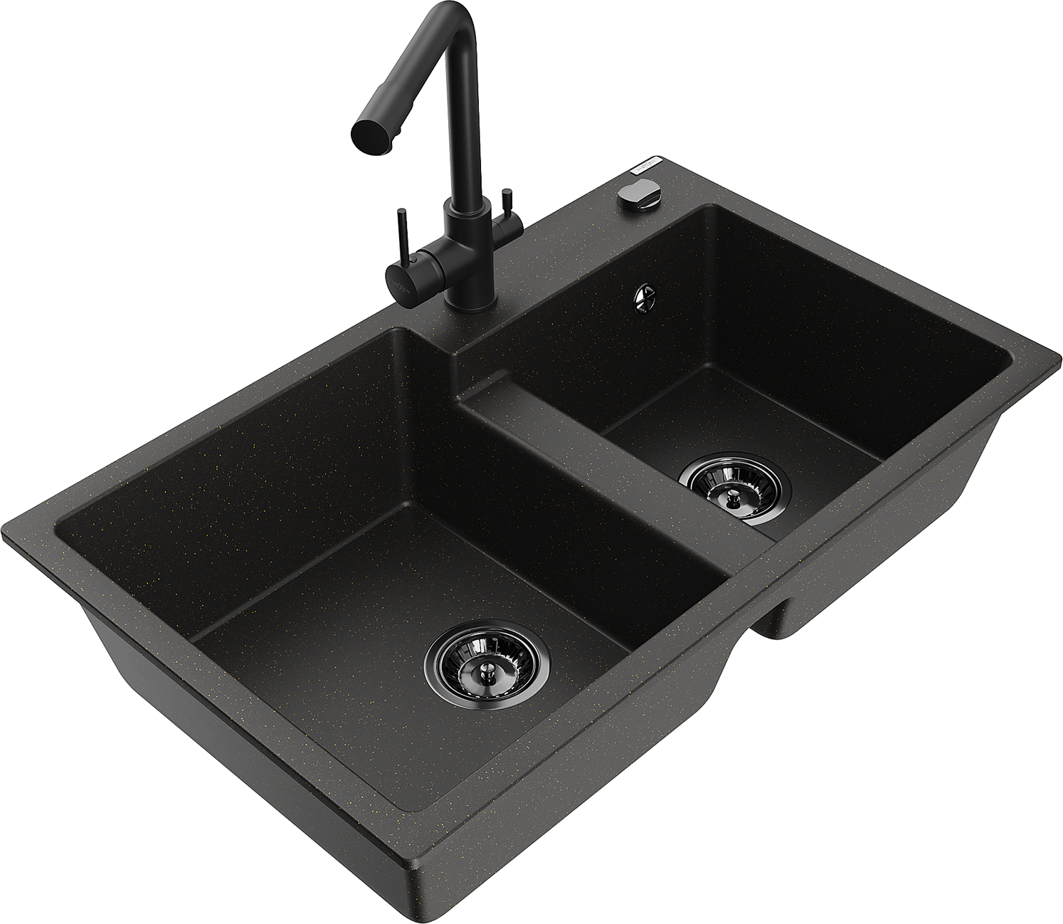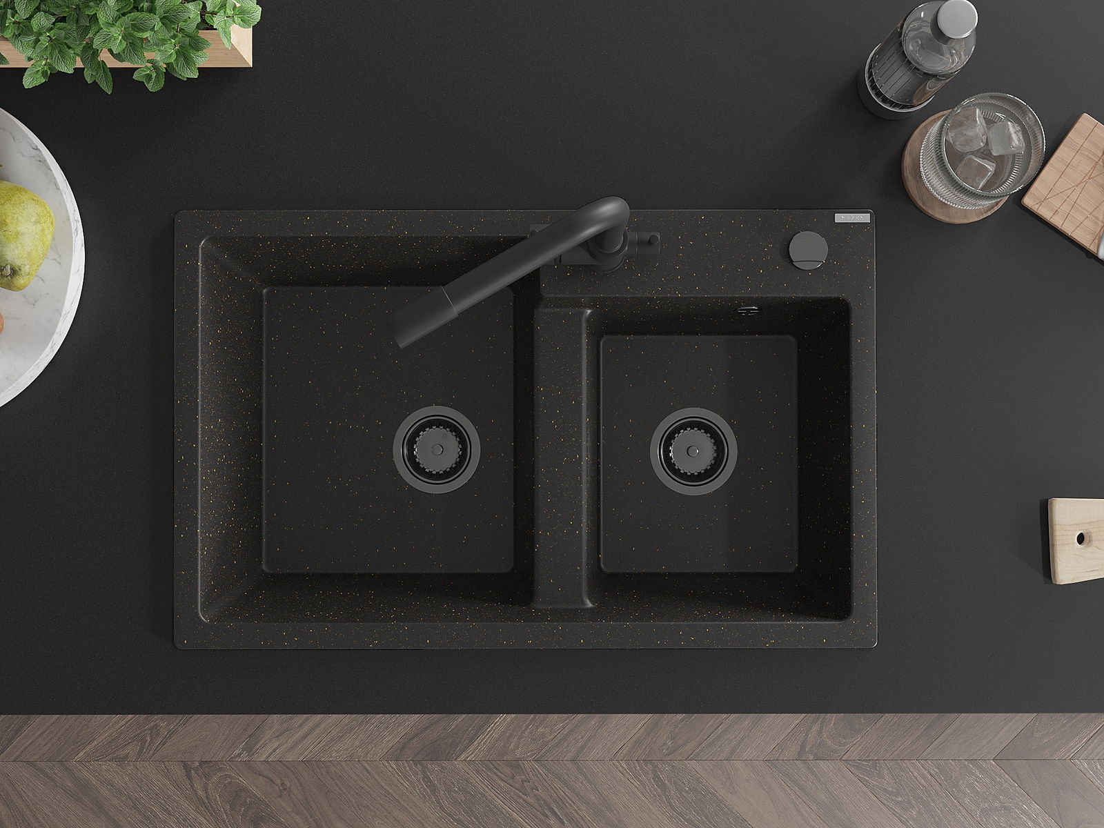 Mexen Tomas zlewozmywak granitowy 2-komorowy z baterią kuchenną Duero, czarny/złoty metalik - 6516-75-671600-70-B