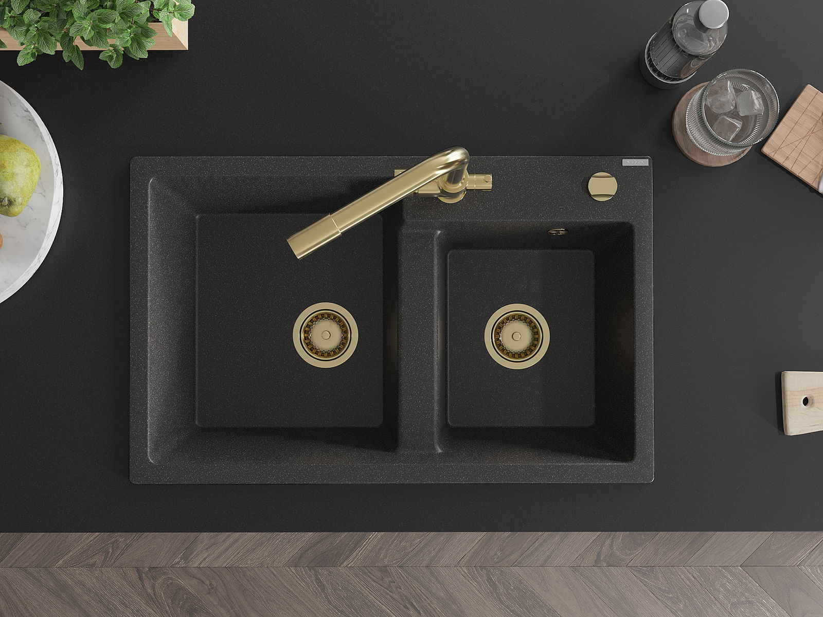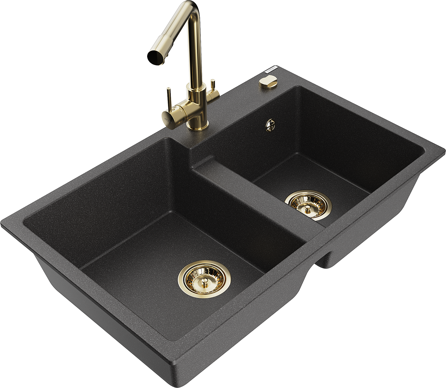 Mexen Tomas zlewozmywak granitowy 2-komorowy z baterią kuchenną Duero, czarny nakrapiany - 6516-76-671600-50