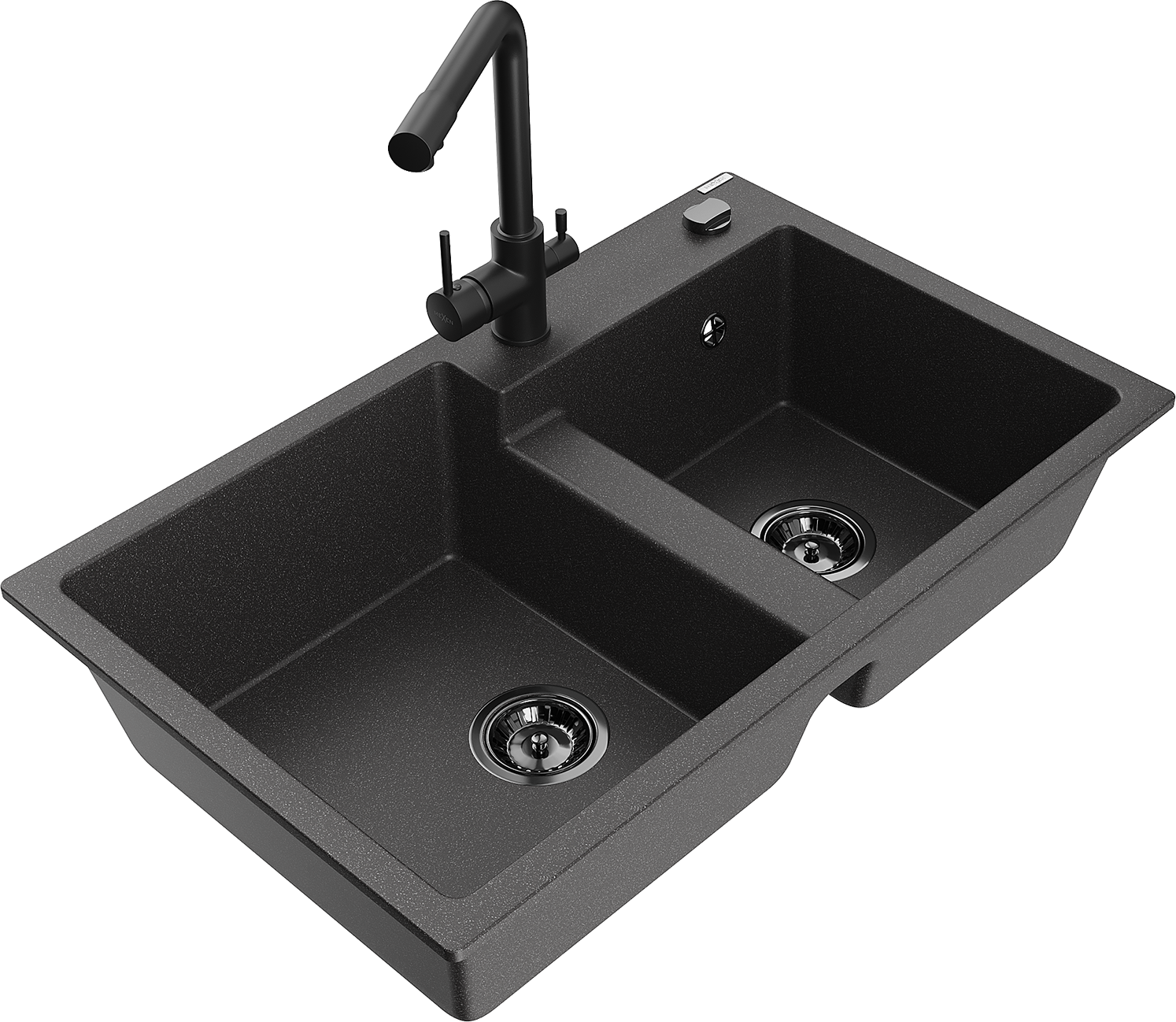 Mexen Tomas zlewozmywak granitowy 2-komorowy z baterią kuchenną Duero, czarny nakrapiany - 6516-76-671600-70-B