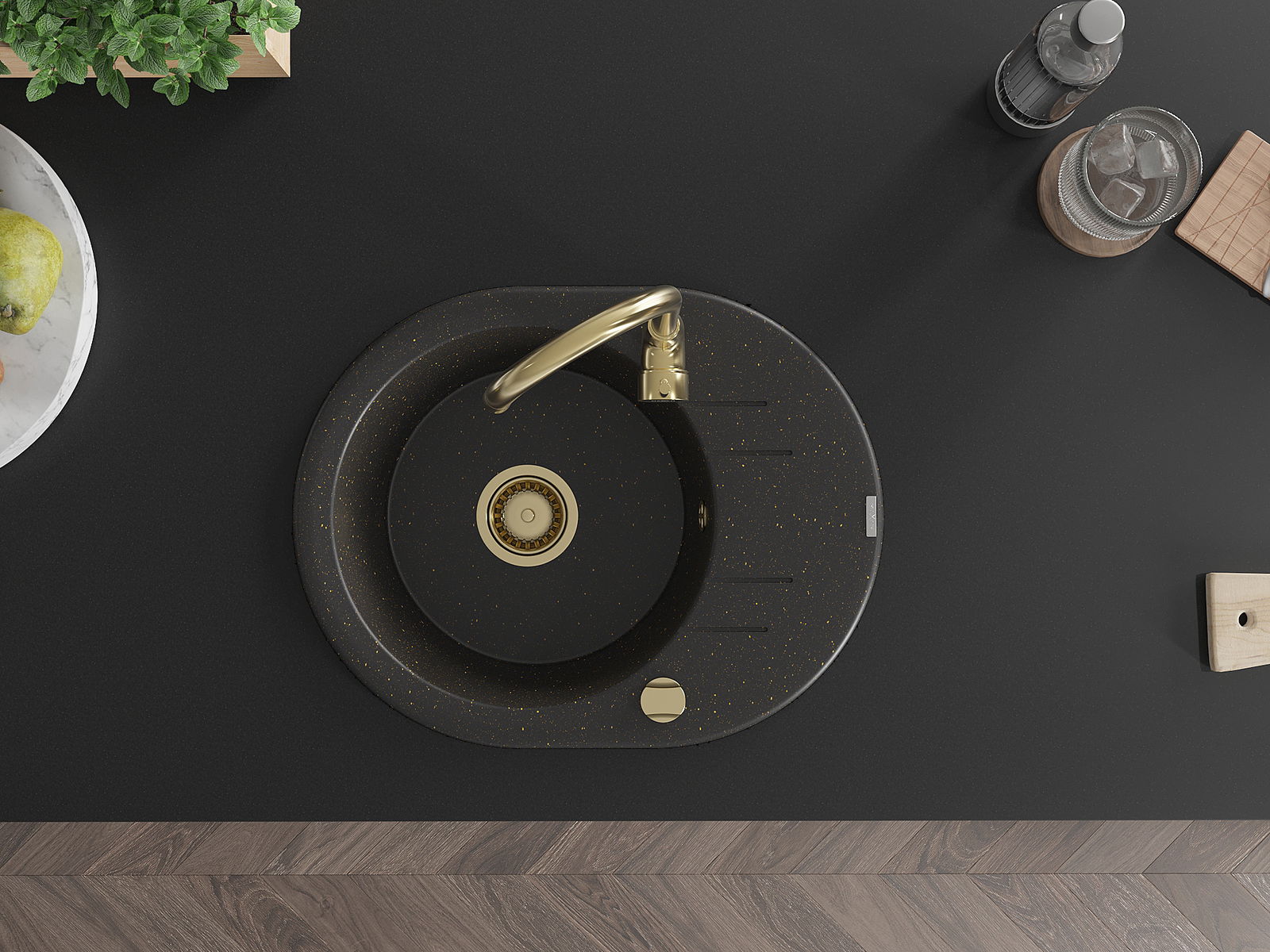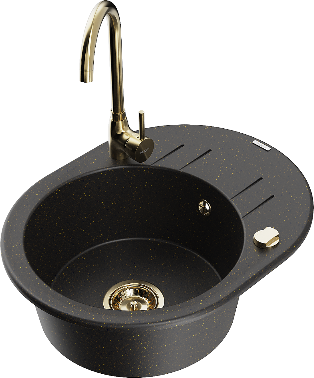 Mexen Kevin zlewozmywak granitowy 1-komorowy z ociekaczem i baterią kuchenną Telma, czarny/złoty metalik - 6517-75-670200-50