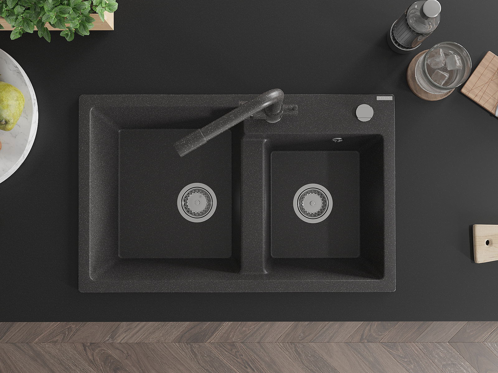 Zlew posiada podfrezowany otwór o średnicy 35 mm do samodzielnego wybicia. Można go wykorzystać m.in. do montażu dozownika na płyn, który wyeliminuje obecność plastikowych butelek w kuchni i nada jej eleganckiego wykończenia.
