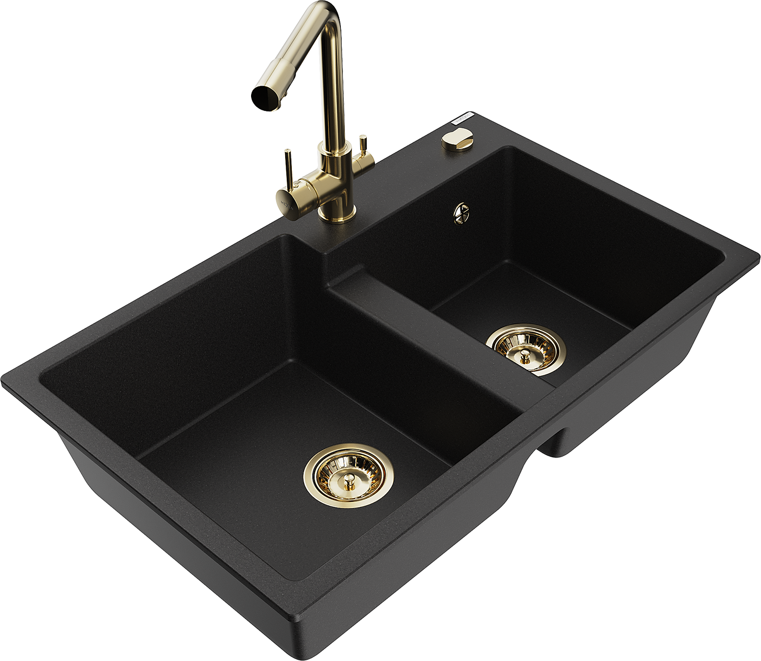 Mexen Tomas zlewozmywak granitowy 2-komorowy z baterią kuchenną Duero, czarny - 6516-77-671600-50