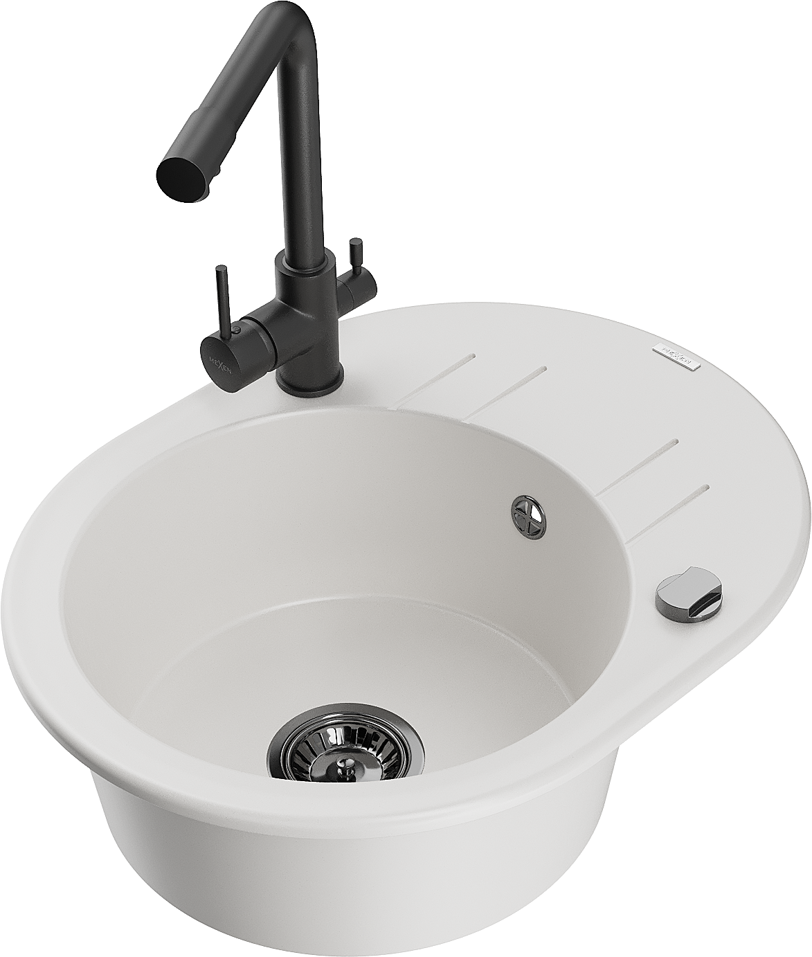 Mexen Kevin zlewozmywak granitowy 1-komorowy z ociekaczem i baterią kuchenną Duero, biały - 6517-20-671600-70
