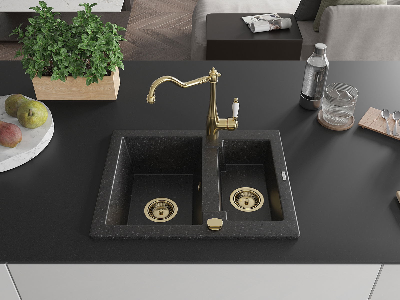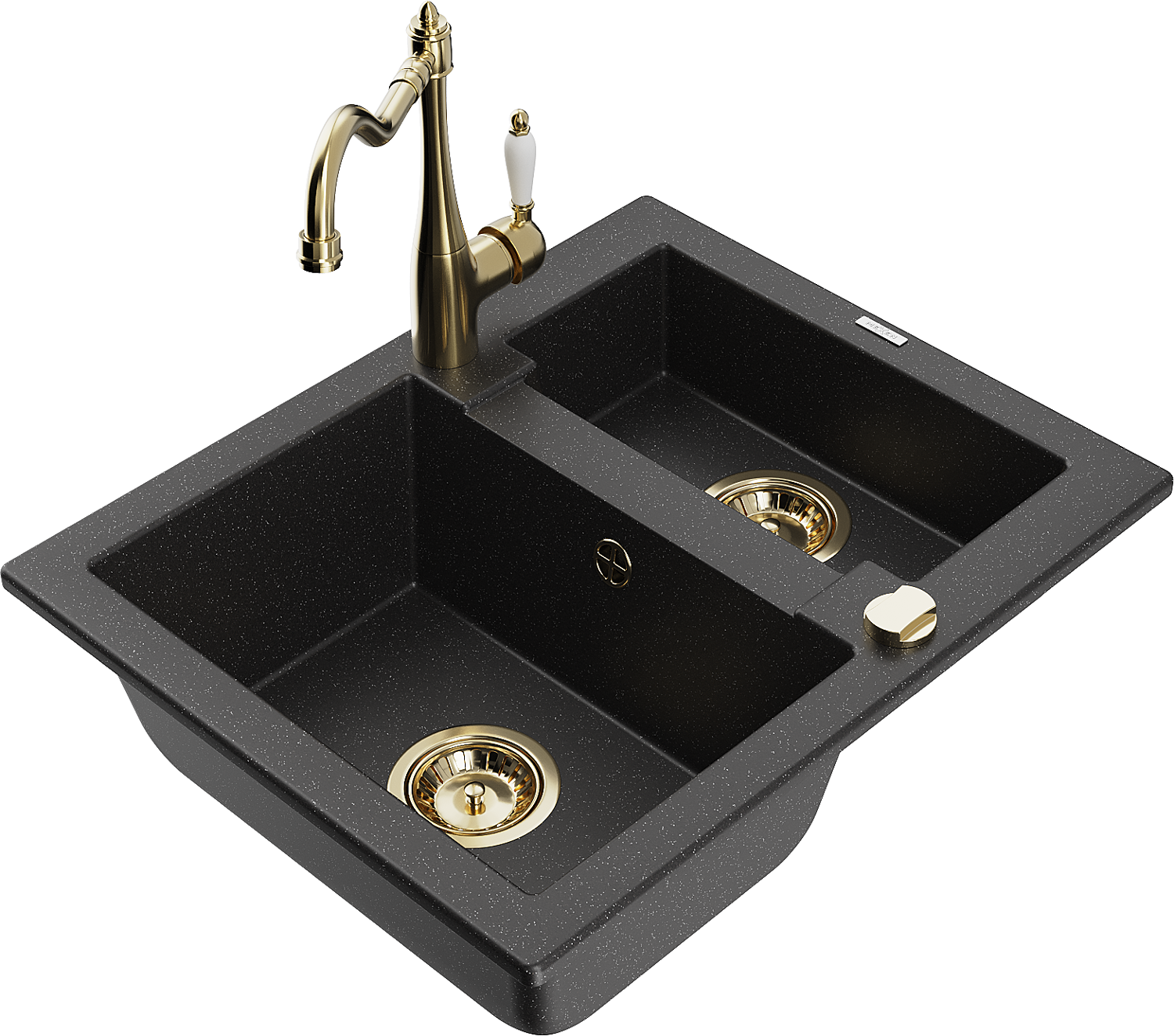 Mexen Carlos zlewozmywak granitowy 1,5-komorowy z baterią kuchenną Carla, czarny/srebrny metalik - 6518-73-670700-50