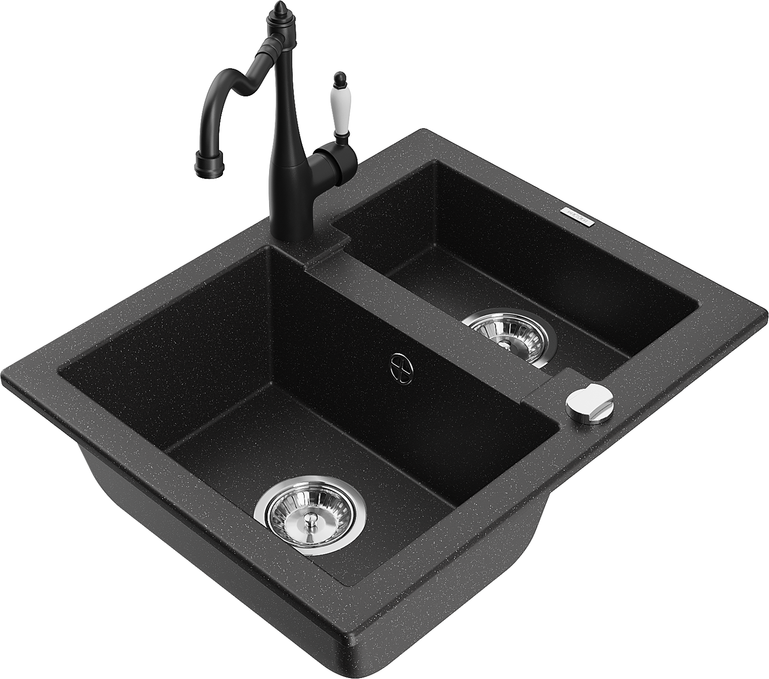 Mexen Carlos zlewozmywak granitowy 1,5-komorowy z baterią kuchenną Carla, czarny/srebrny metalik - 6518-73-670700-70