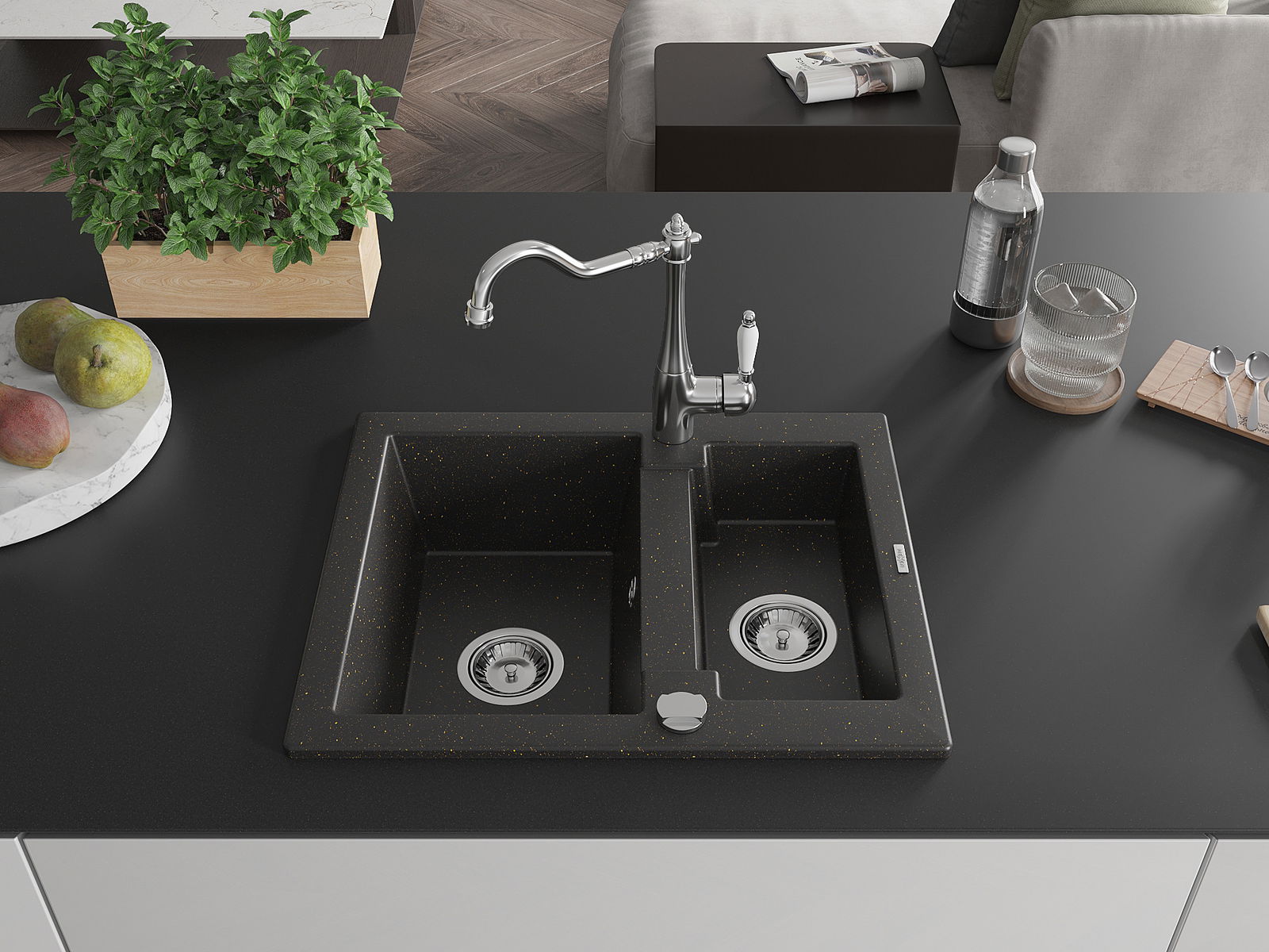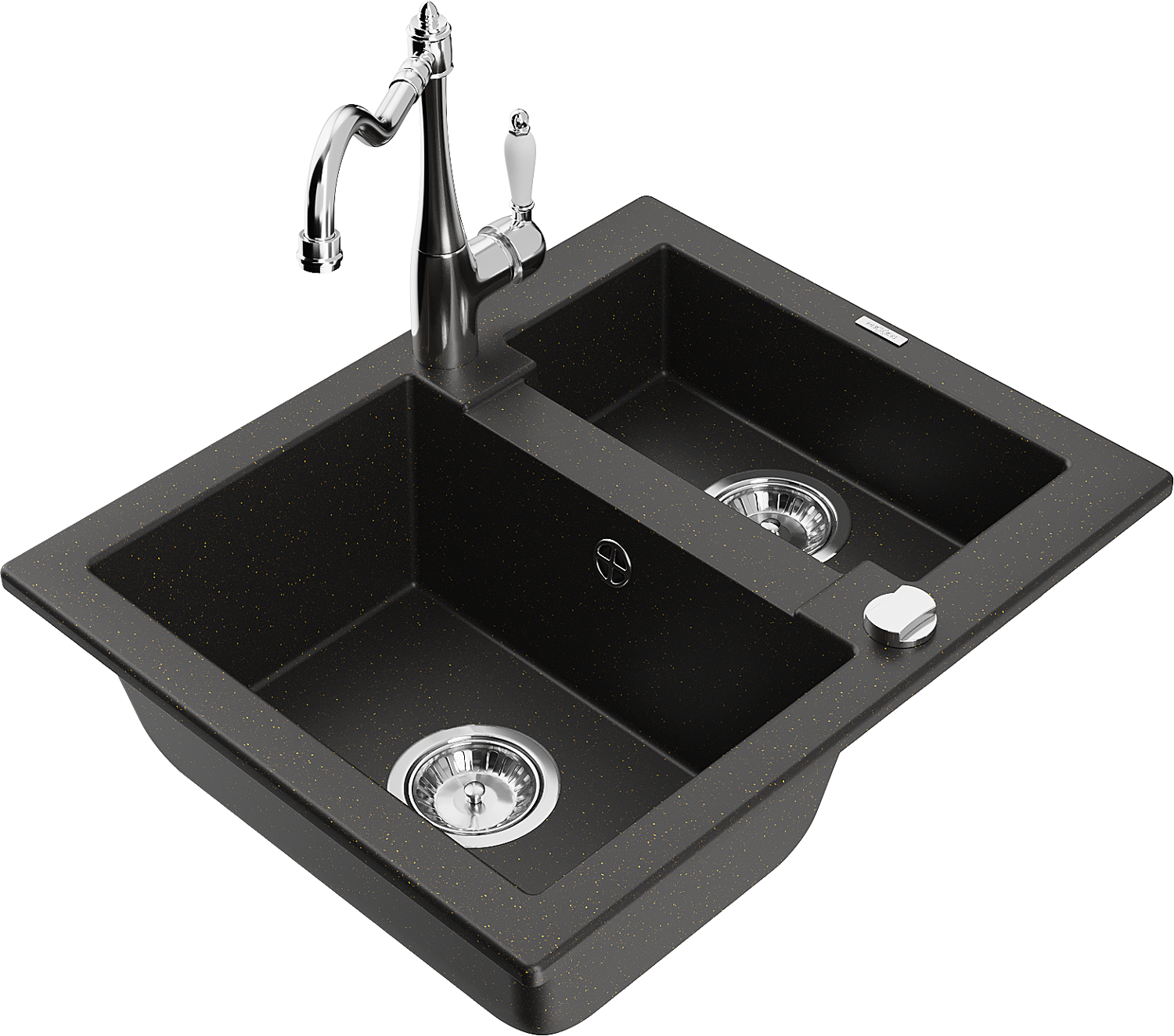 Mexen Carlos zlewozmywak granitowy 1,5-komorowy z baterią kuchenną Carla, czarny/złoty metalik - 6518-75-670700-00