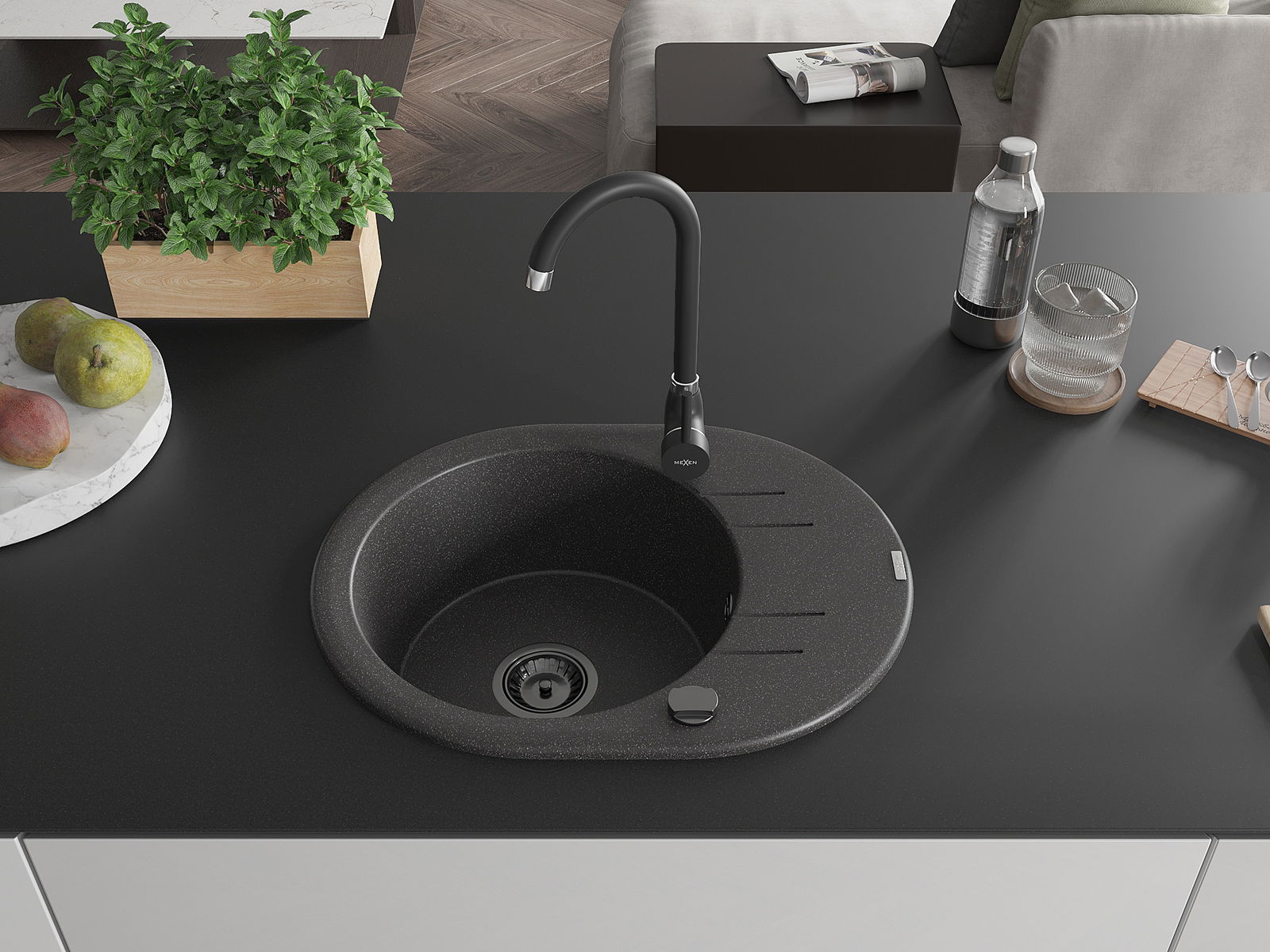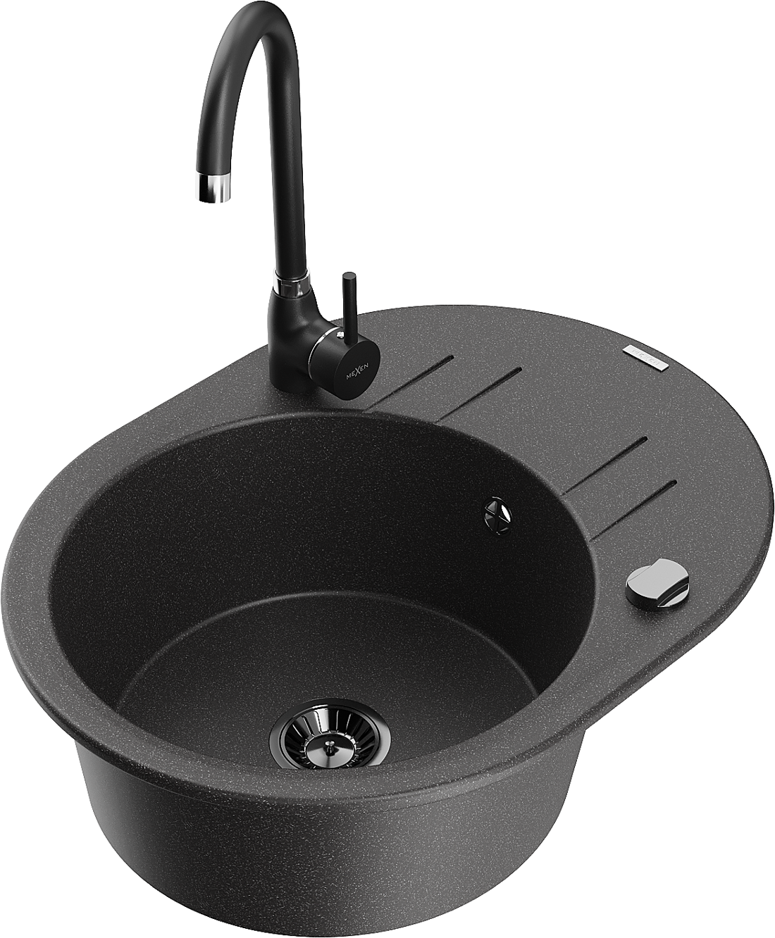 Mexen Kevin zlewozmywak granitowy 1-komorowy z ociekaczem i baterią kuchenną Telma, czarny nakrapiany - 6517-76-670200-70-B