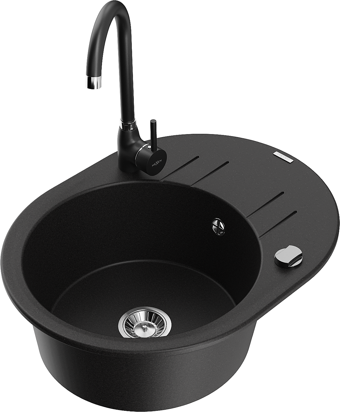 Mexen Kevin zlewozmywak granitowy 1-komorowy z ociekaczem i baterią kuchenną Telma, czarny - 6517-77-670200-70