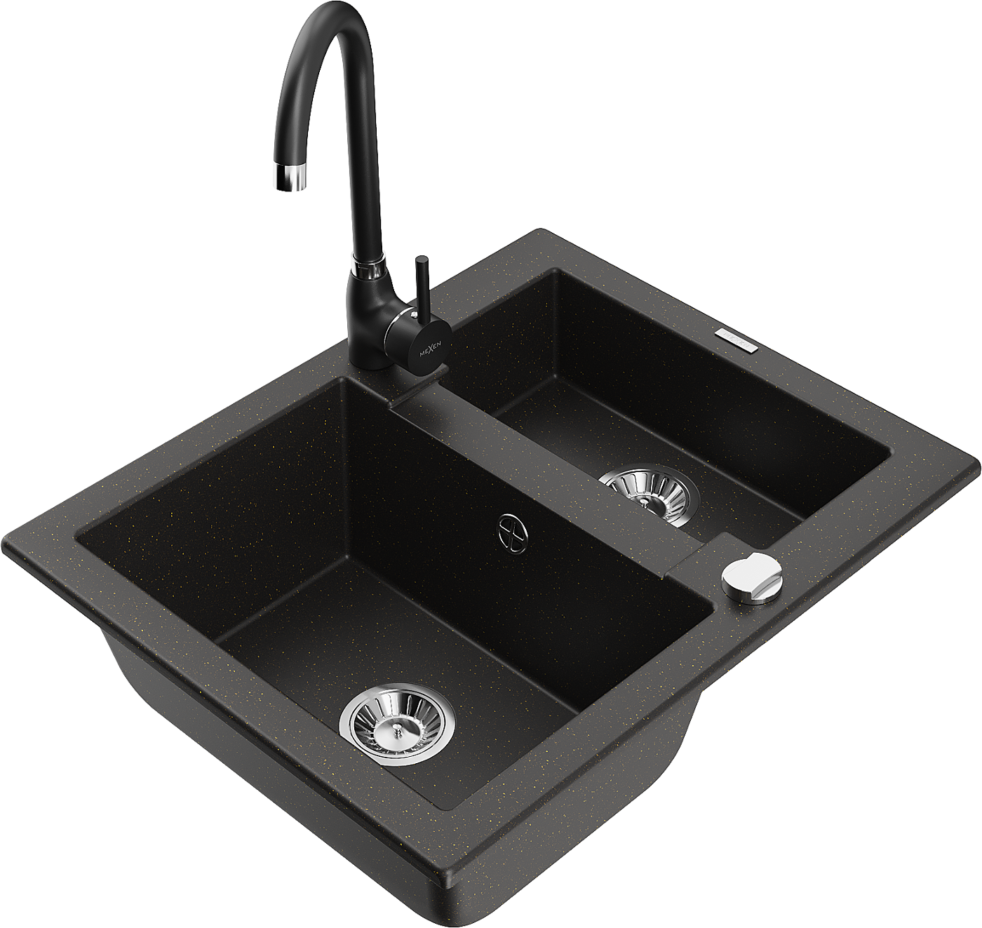 Mexen Carlos zlewozmywak granitowy 1,5-komorowy z baterią kuchenną Telma, czarny/złoty metalik - 6518-75-670200-70