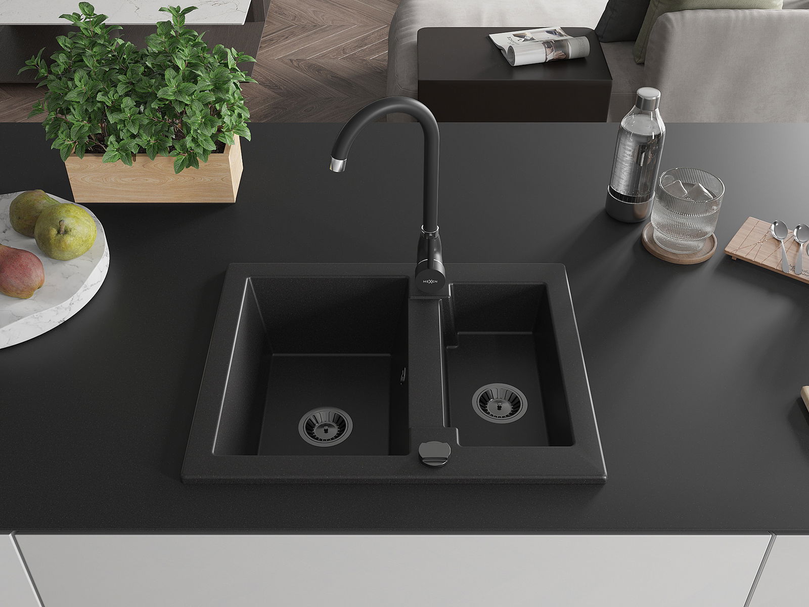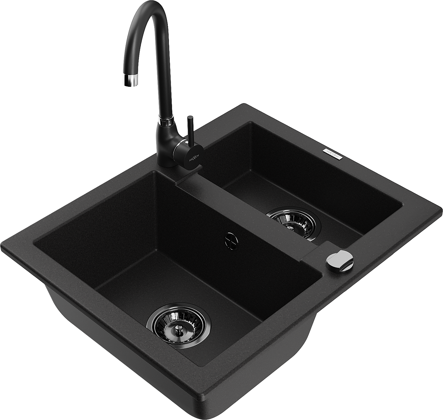 Mexen Carlos zlewozmywak granitowy 1,5-komorowy z baterią kuchenną Telma, czarny - 6518-77-670200-70-B