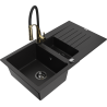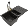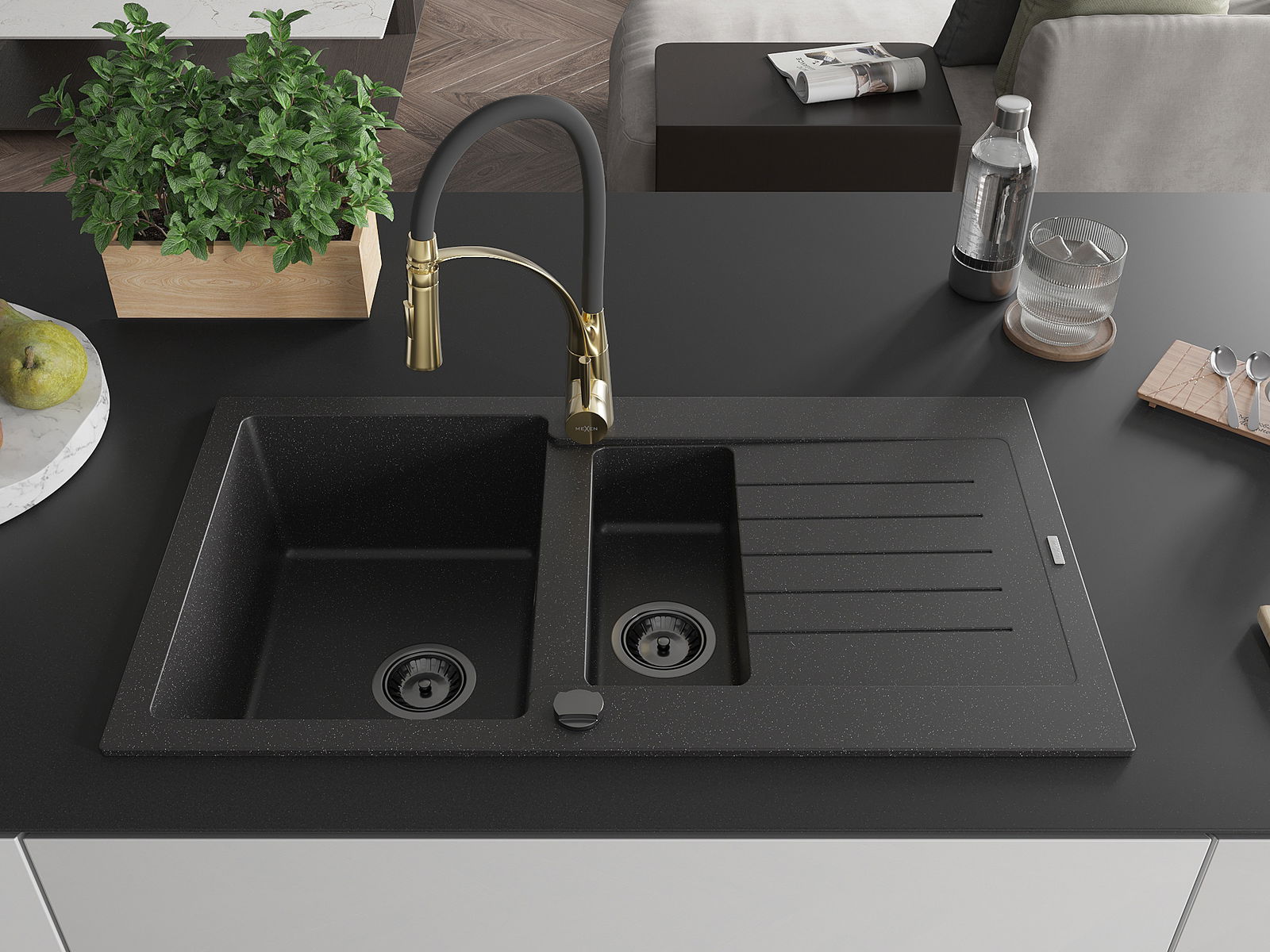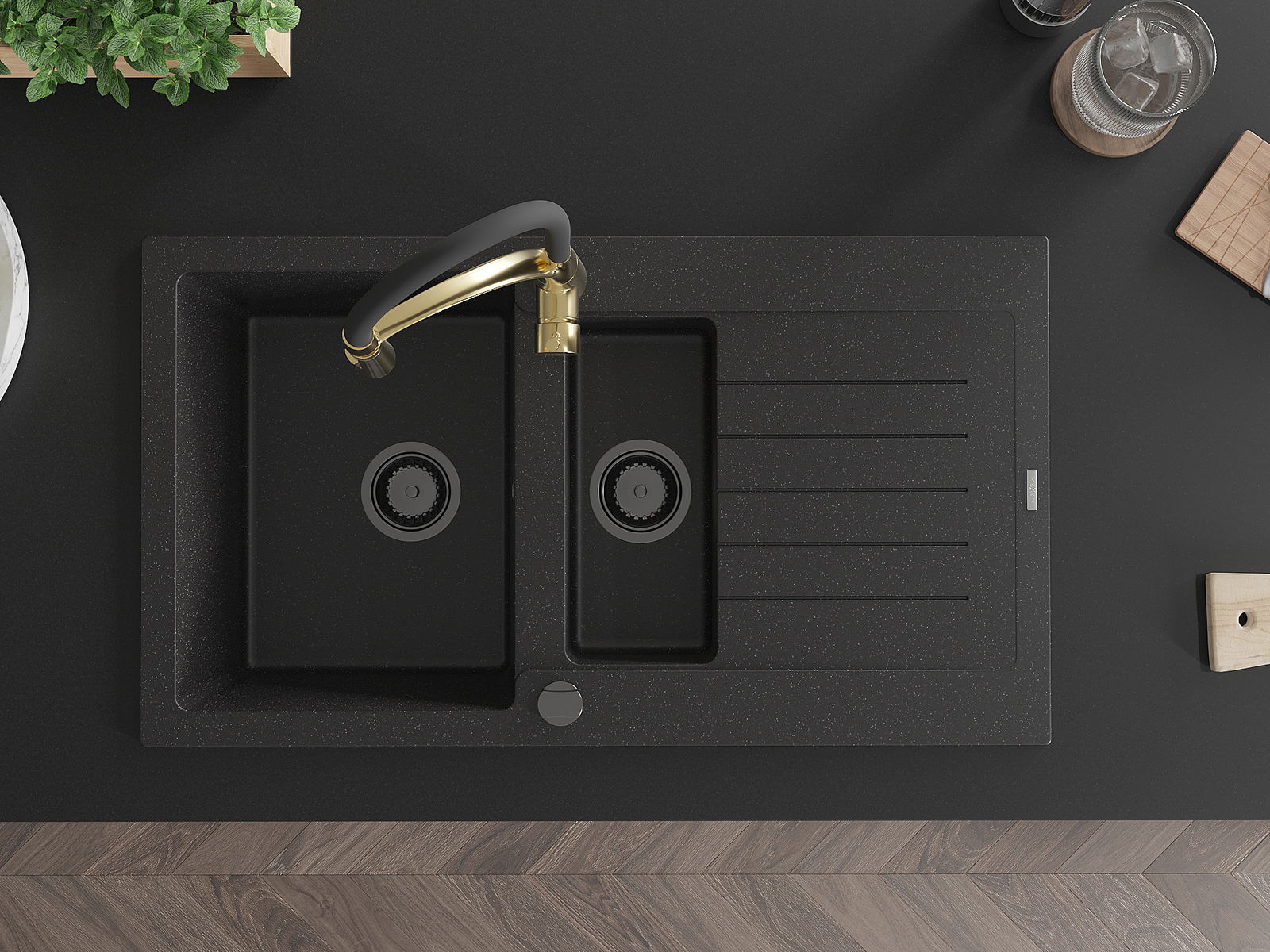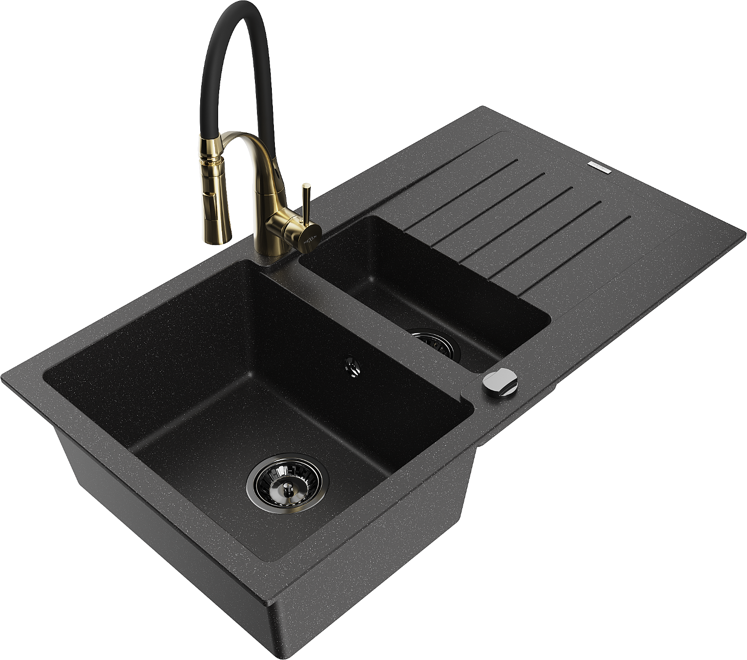 Mexen Matias zlewozmywak granitowy 1,5-komorowy z ociekaczem i baterią kuchenną Aster, czarny/srebrny - 6502-73-73450-57-B