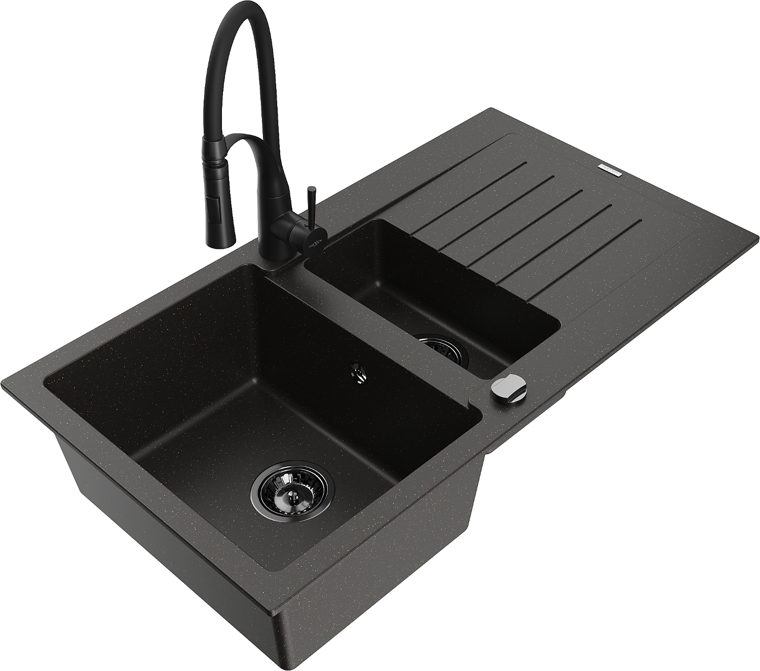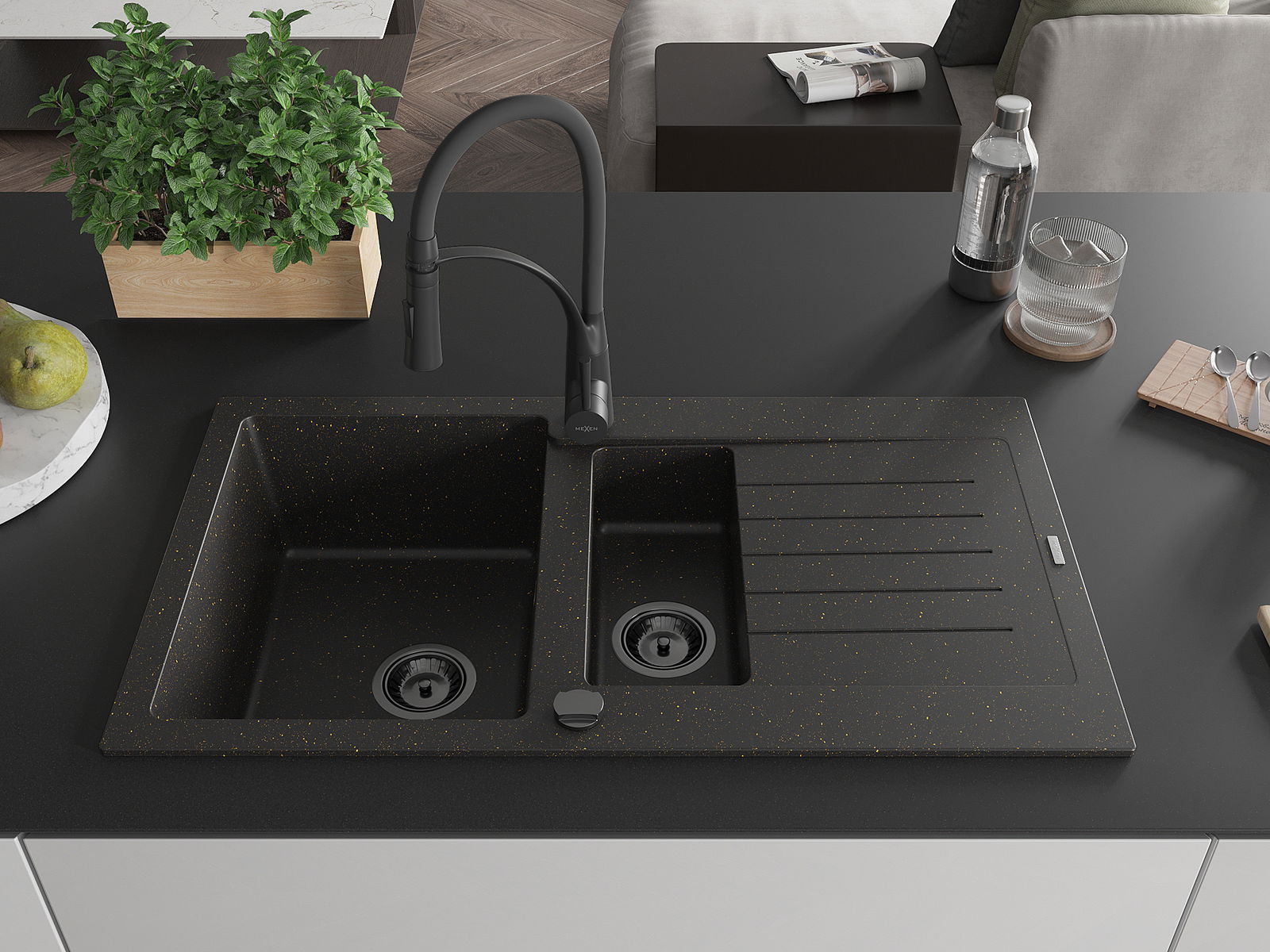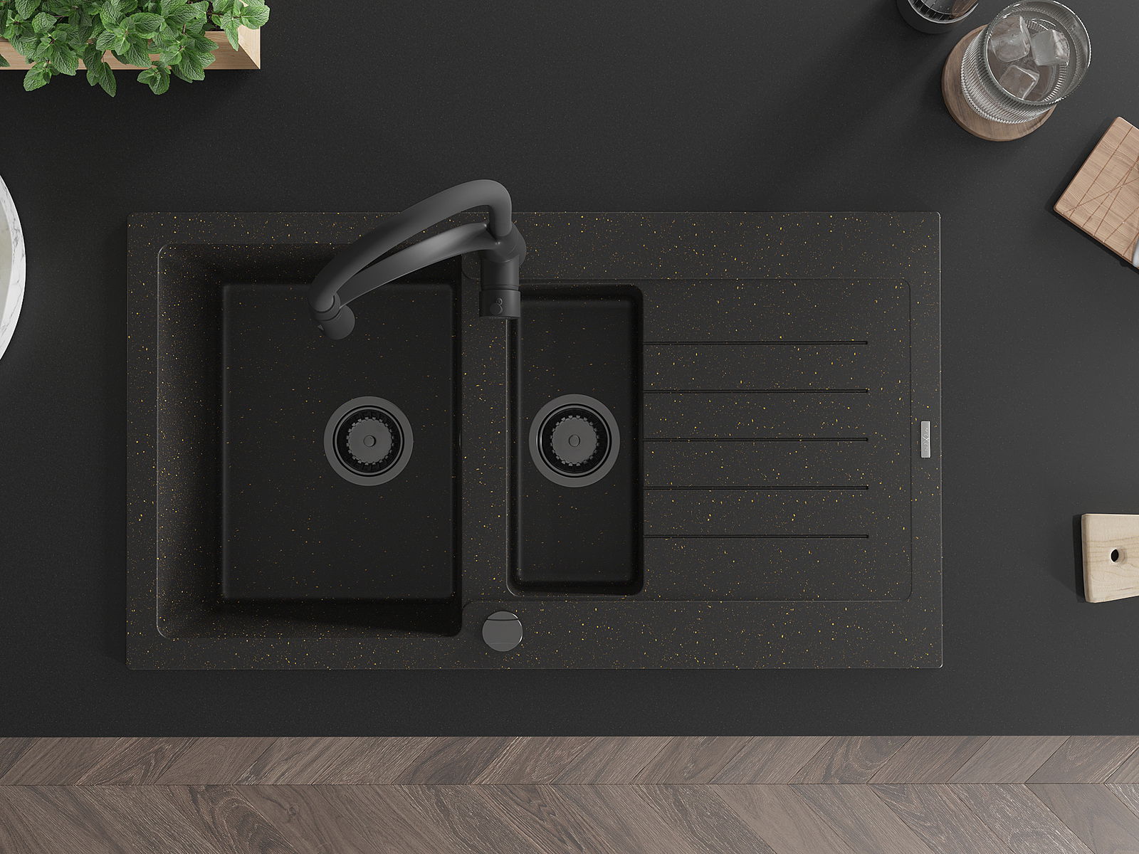 Mexen Matias zlewozmywak granitowy 1,5-komorowy z ociekaczem i baterią kuchenną Aster, czarny/złoty metalik - 6502-75-73450-70-B