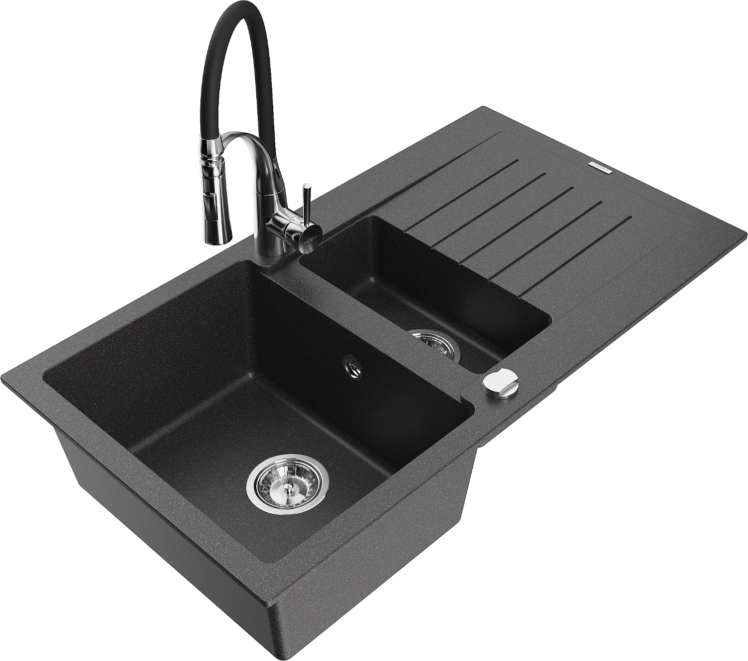 Mexen Matias zlewozmywak granitowy 1,5-komorowy z ociekaczem i baterią kuchenną Aster, czarny nakrapiany - 6502-76-73450-07