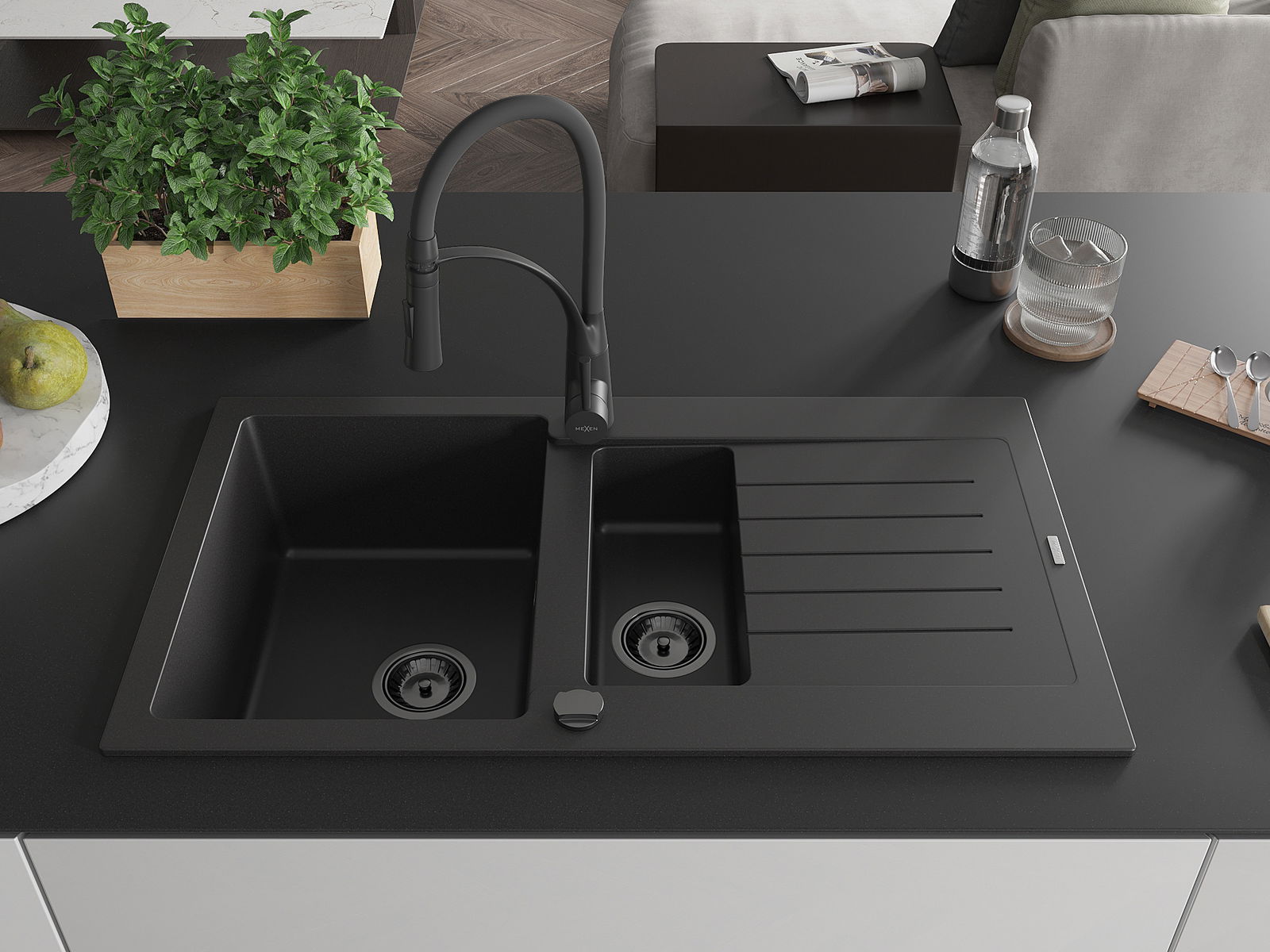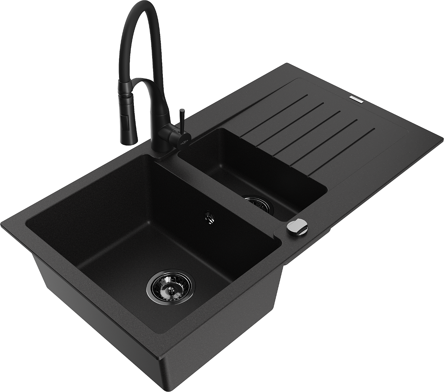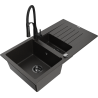 Mexen Matias zlewozmywak granitowy 1,5-komorowy z ociekaczem i baterią kuchenną Aster, czarny - 6502-77-73450-70-B
