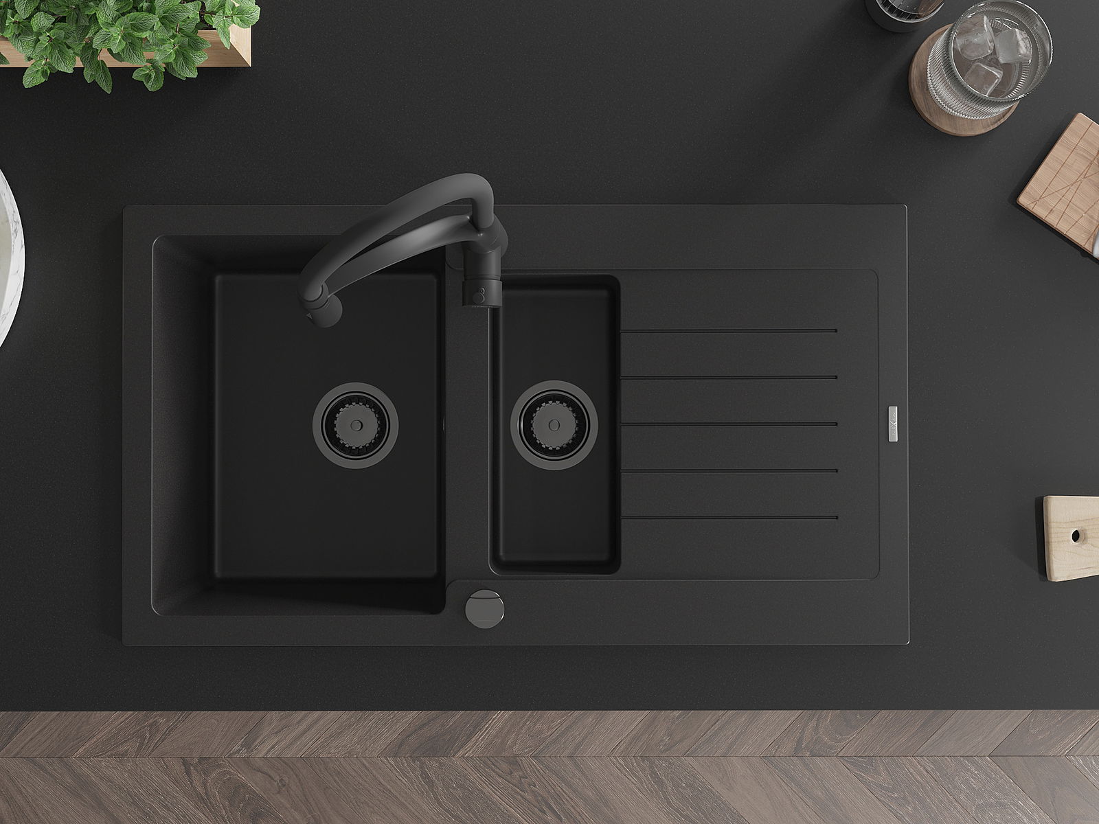 Dzięki zastosowaniu uniwersalnego systemu mocowania, zlew jest odwracalny, a ociekacz może zostać zamontowany na blacie po lewej lub prawej stronie. W ten sposób możesz z łatwością dopasować stronę do swoich potrzeb i warunków.