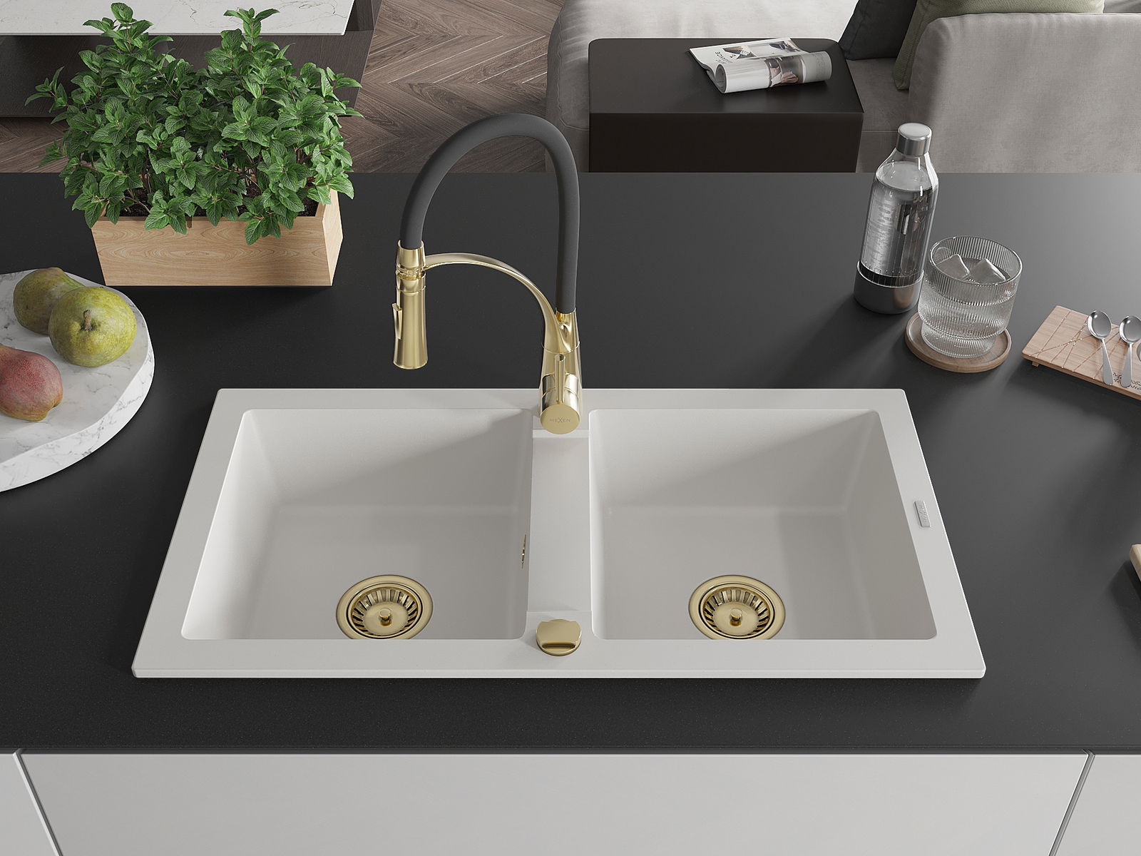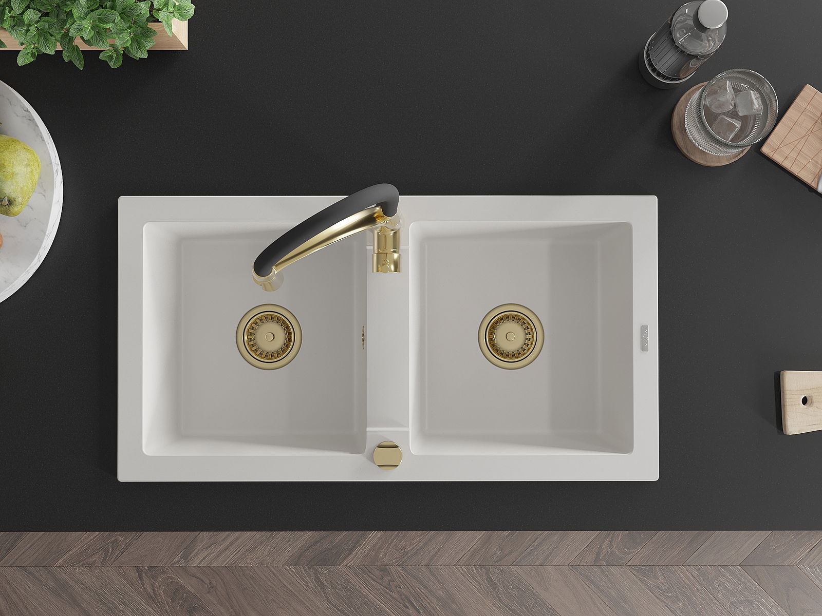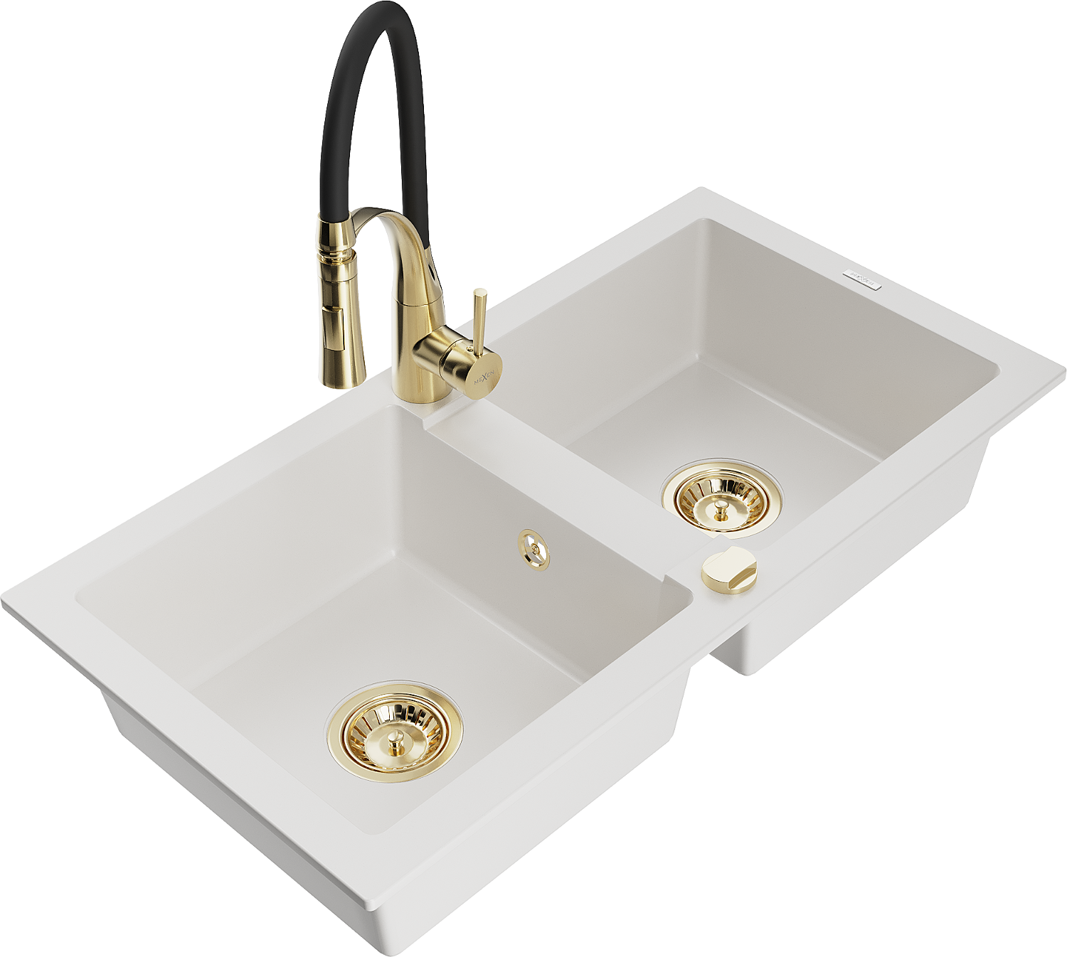 Mexen Mario zlewozmywak granitowy 2-komorowy z baterią kuchenną Aster, biały - 6504-20-73450-57-G