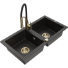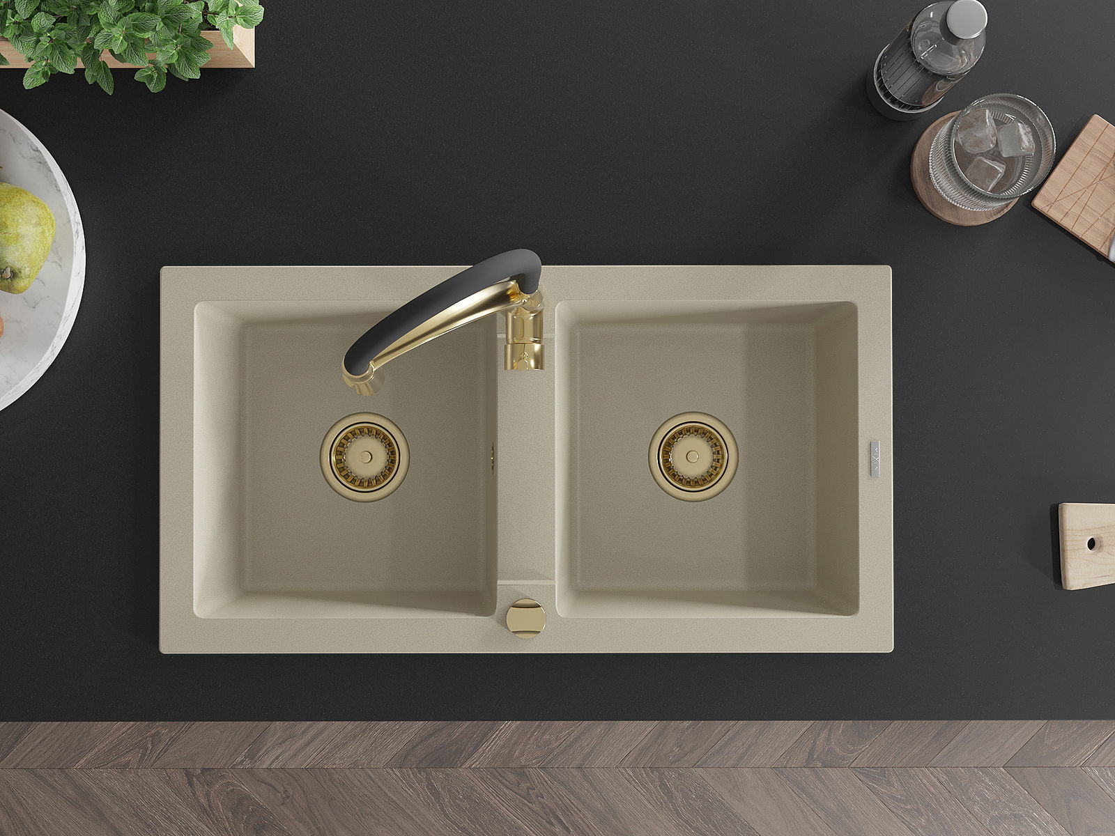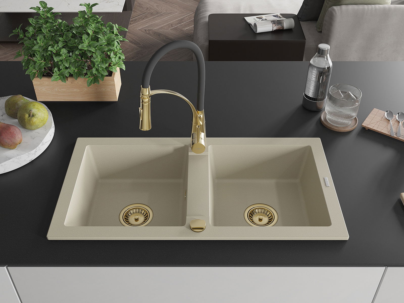 Mexen Mario zlewozmywak granitowy 2-komorowy z baterią kuchenną Aster, beżowy - 6504-69-73450-57-G