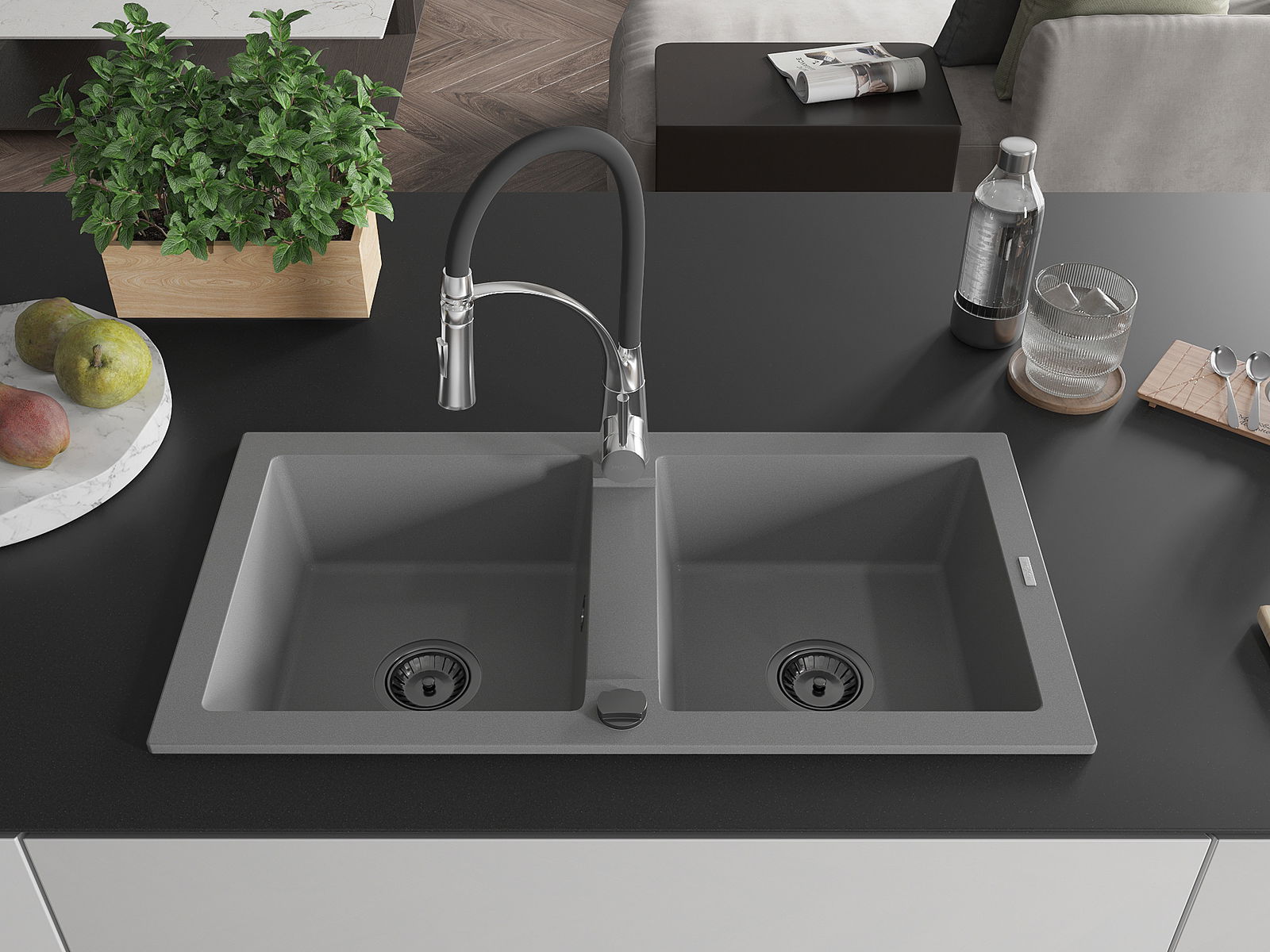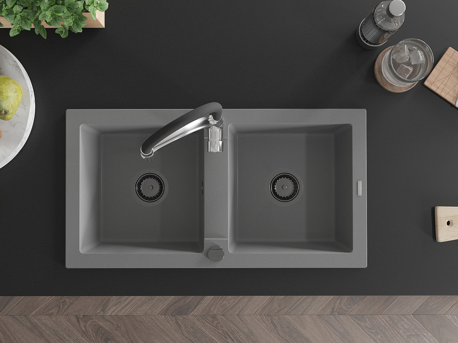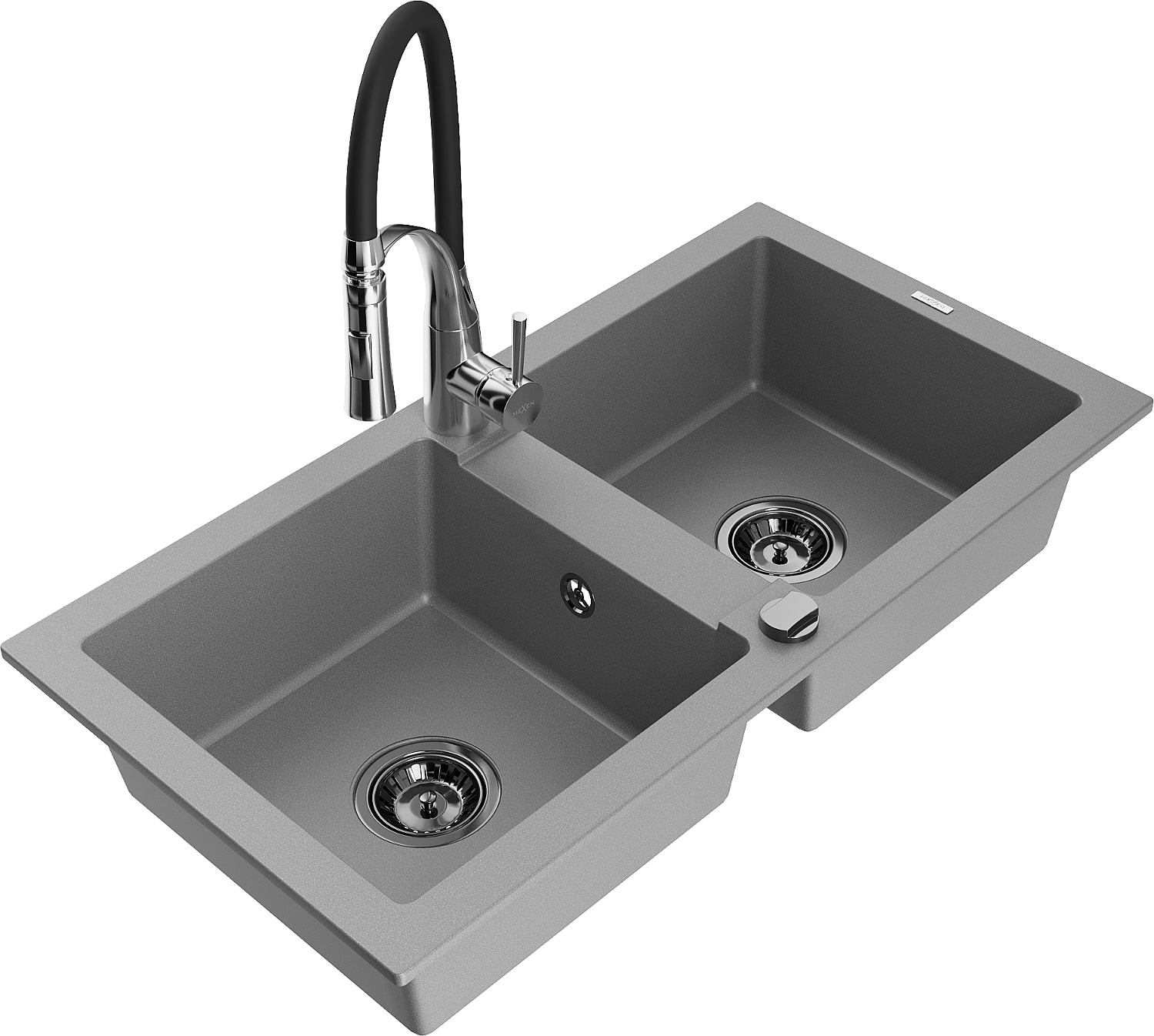 Mexen Mario zlewozmywak granitowy 2-komorowy z baterią kuchenną Aster, szary - 6504-71-73450-07-B