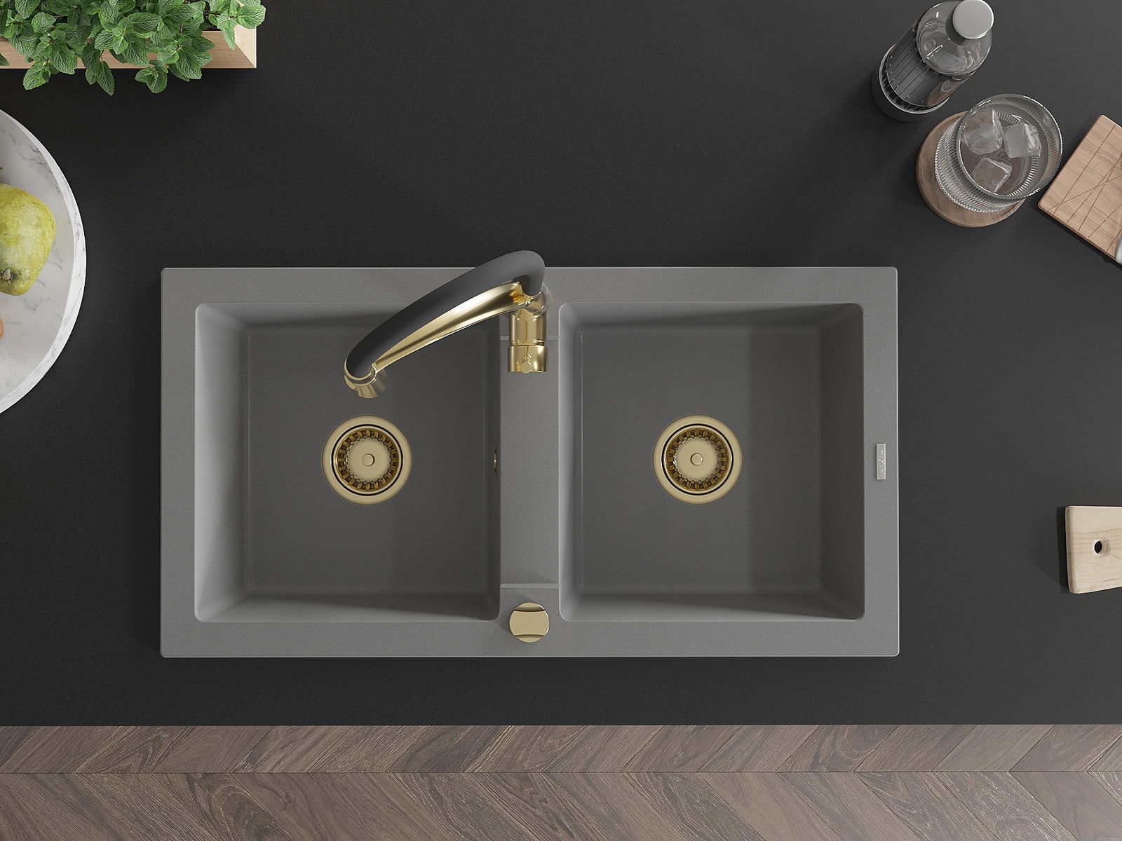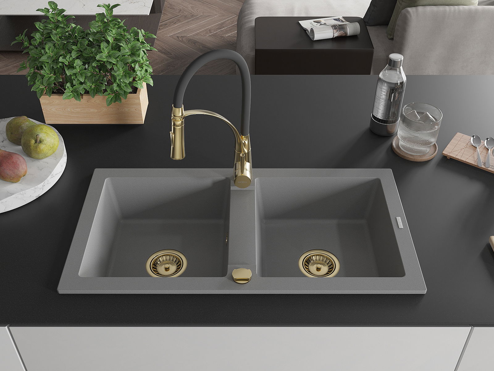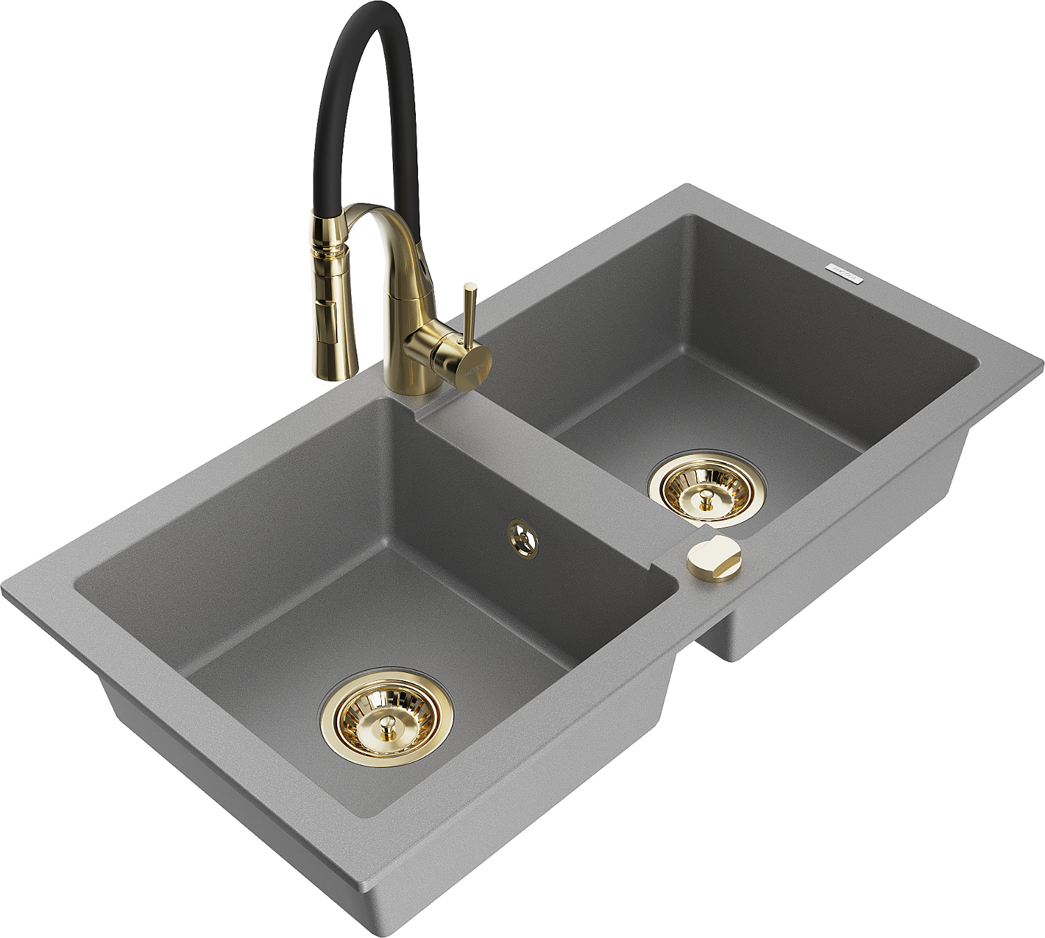 Mexen Mario zlewozmywak granitowy 2-komorowy z baterią kuchenną Aster, szary - 6504-71-73450-57-G