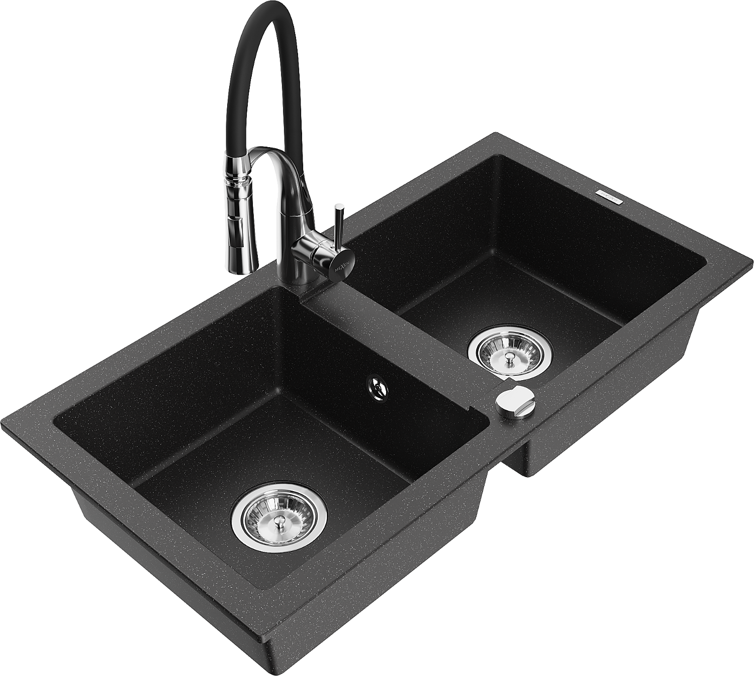 Mexen Mario zlewozmywak granitowy 2-komorowy z baterią kuchenną Aster, czarny/srebrny metalik - 6504-73-73450-07