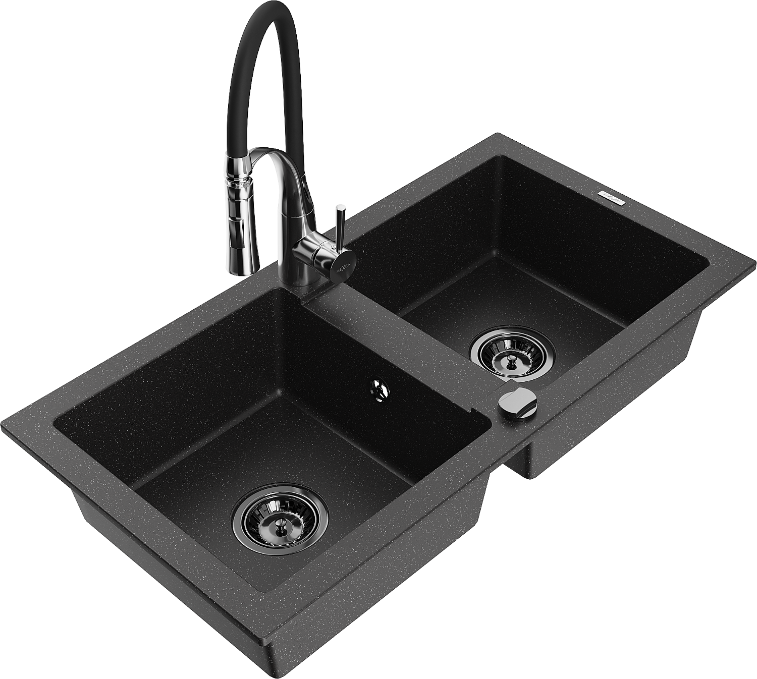 Mexen Mario zlewozmywak granitowy 2-komorowy z baterią kuchenną Aster, czarny/srebrny metalik - 6504-73-73450-07-B