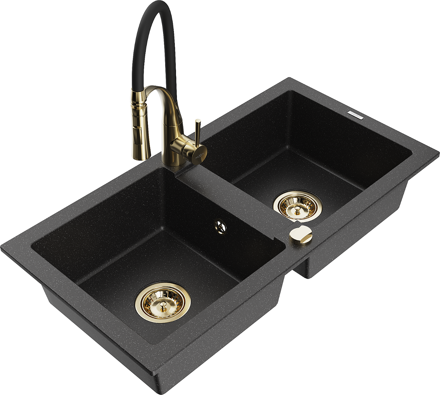 Mexen Mario zlewozmywak granitowy 2-komorowy z baterią kuchenną Aster, czarny/srebrny metalik - 6504-73-73450-57-G