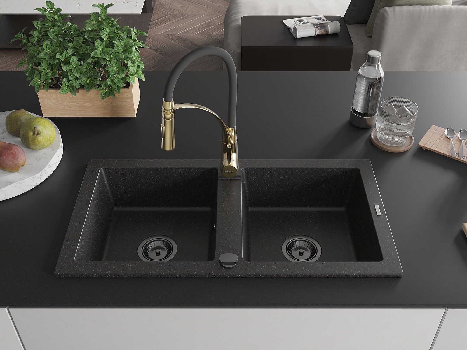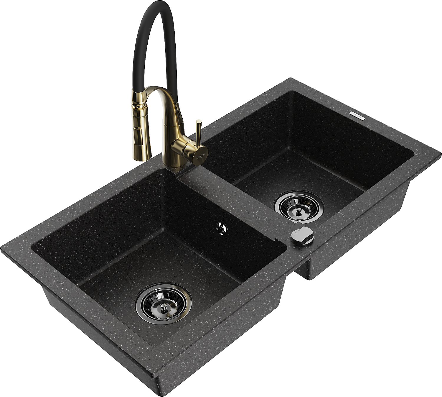 Mexen Mario zlewozmywak granitowy 2-komorowy z baterią kuchenną Aster, czarny/srebrny metalik - 6504-73-73450-57-B