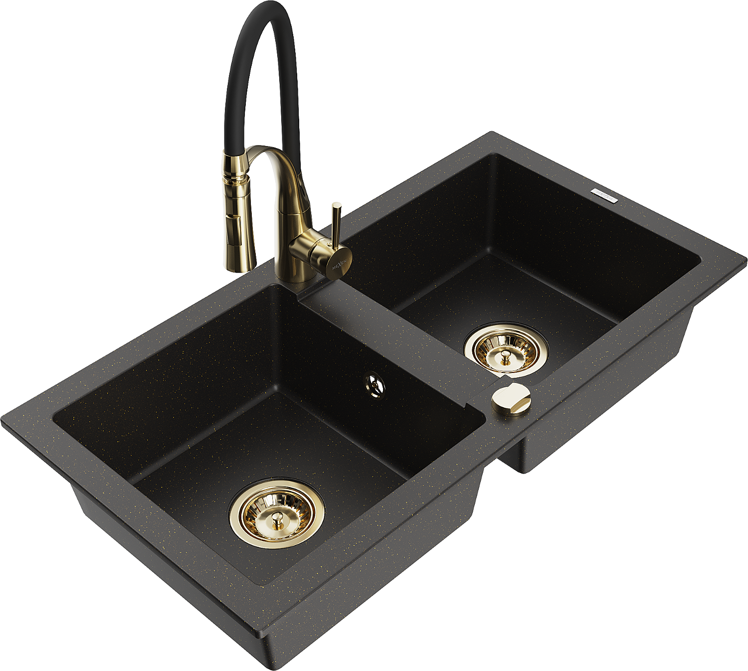 Mexen Mario zlewozmywak granitowy 2-komorowy z baterią kuchenną Aster, czarny/złoty metalik - 6504-75-73450-57-G