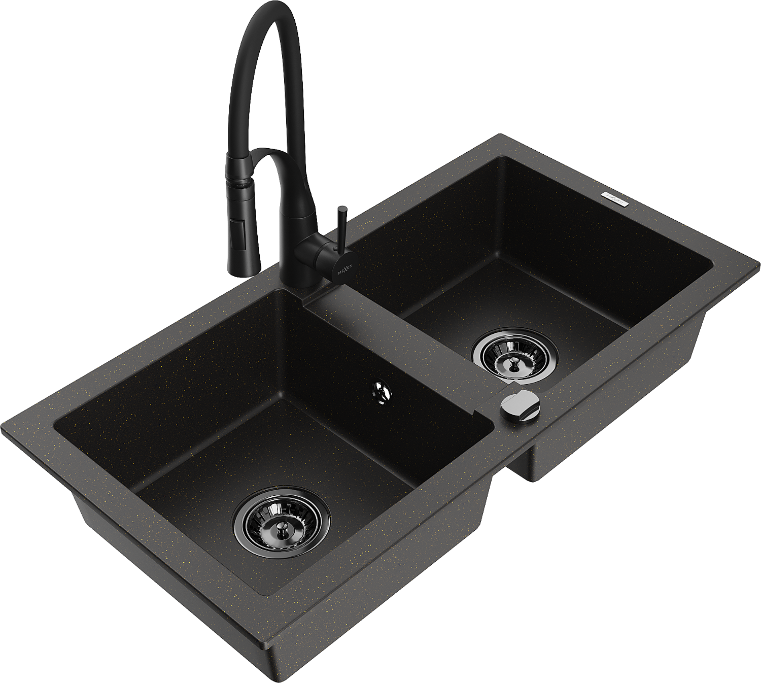 Mexen Mario zlewozmywak granitowy 2-komorowy z baterią kuchenną Aster, czarny/złoty metalik - 6504-75-73450-70-B
