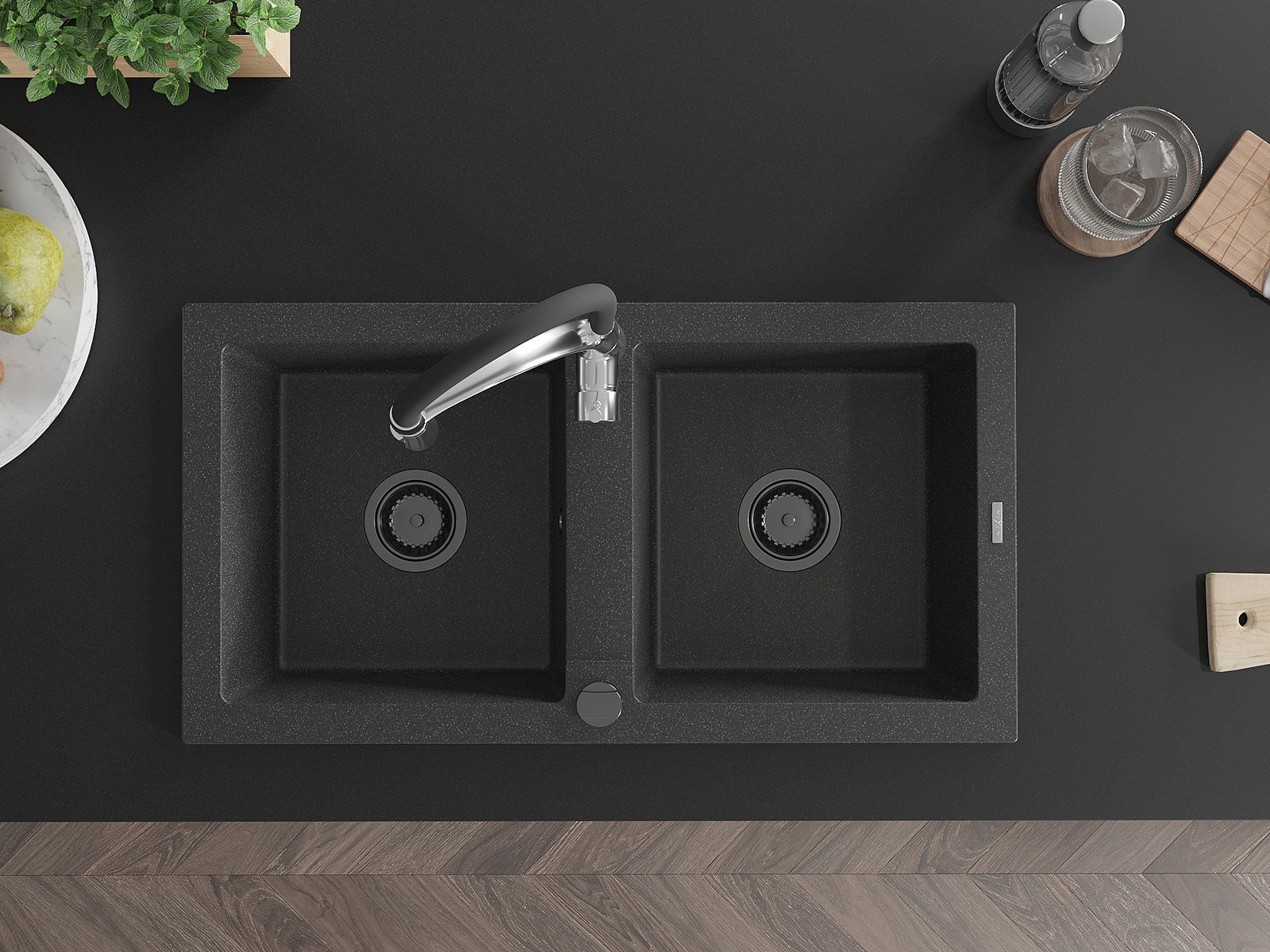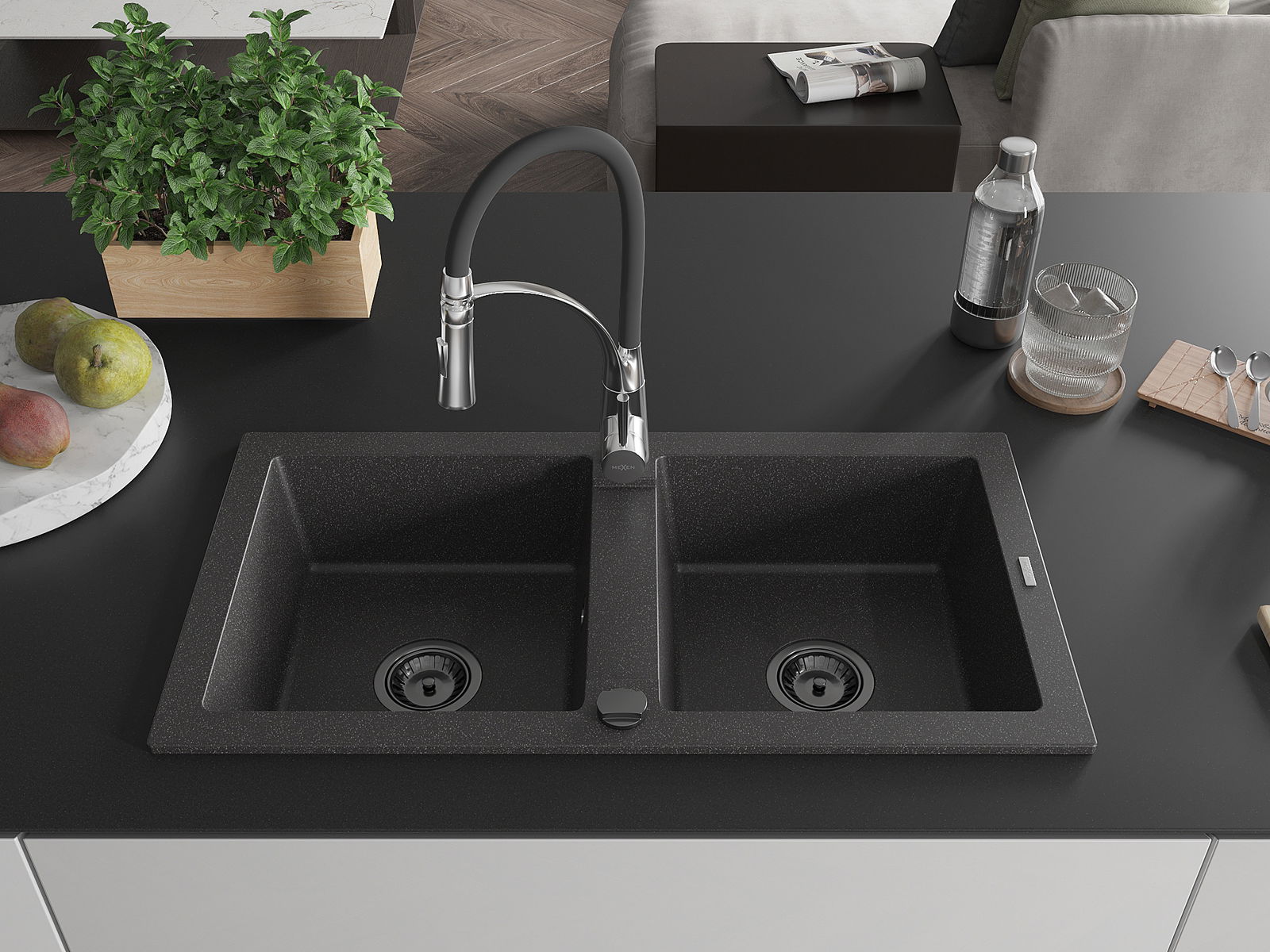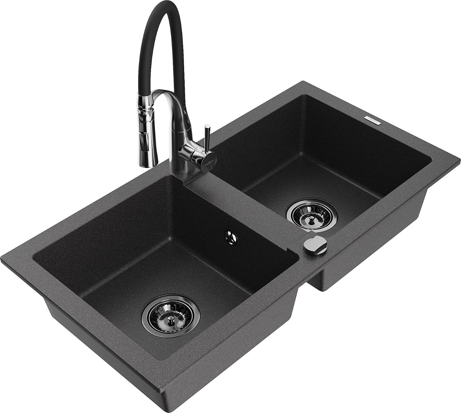 Mexen Mario zlewozmywak granitowy 2-komorowy z baterią kuchenną Aster, czarny nakrapiany - 6504-76-73450-07-B